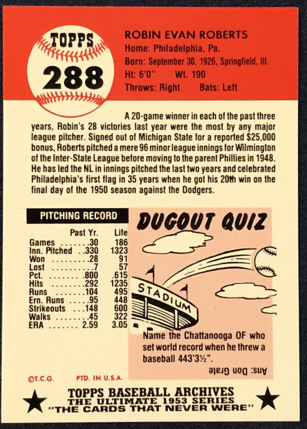 Lot 364 1991 TOPPS ARCHIVES (1953 SERIES) - ROBIN ROBERTS (HOF)