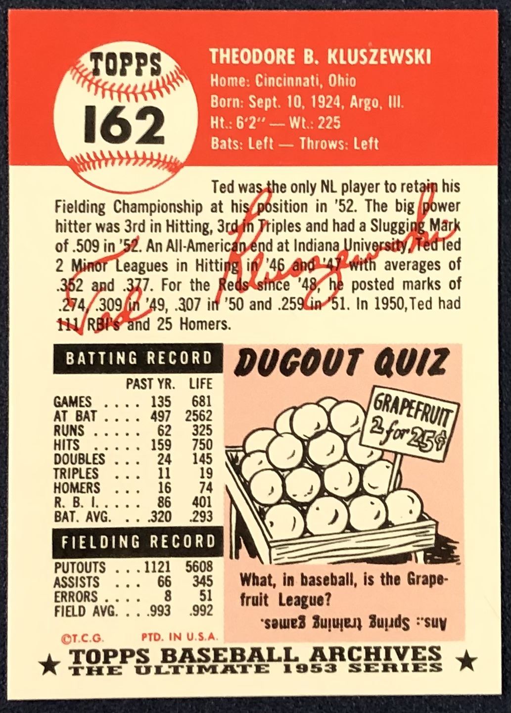 Lot 369 1991 TOPPS ARCHIVES (1953 SERIES) - TED KLUSZEWSKI (HOF)