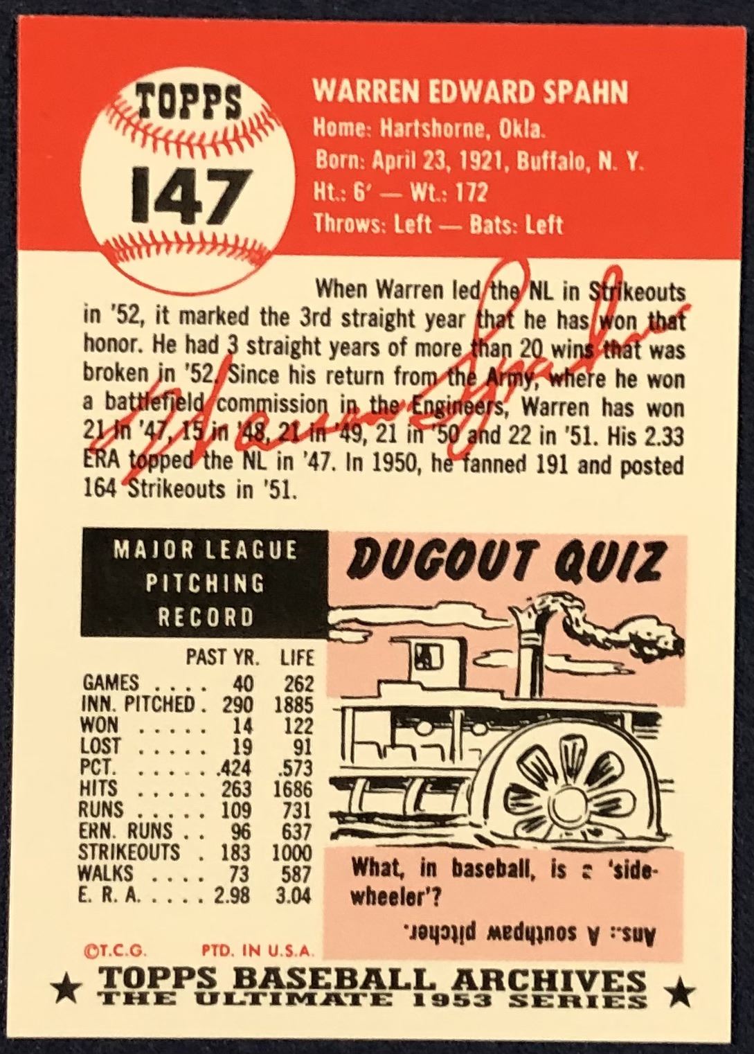 Lot 371 1991 TOPPS ARCHIVES (1953 SERIES) - WARREN SPAHN (HOF)