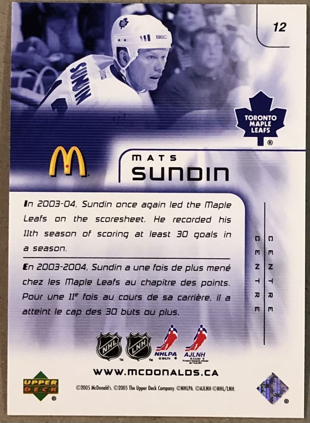 McDonald's #12 NHL, hockey, UD, regional, hall of fame