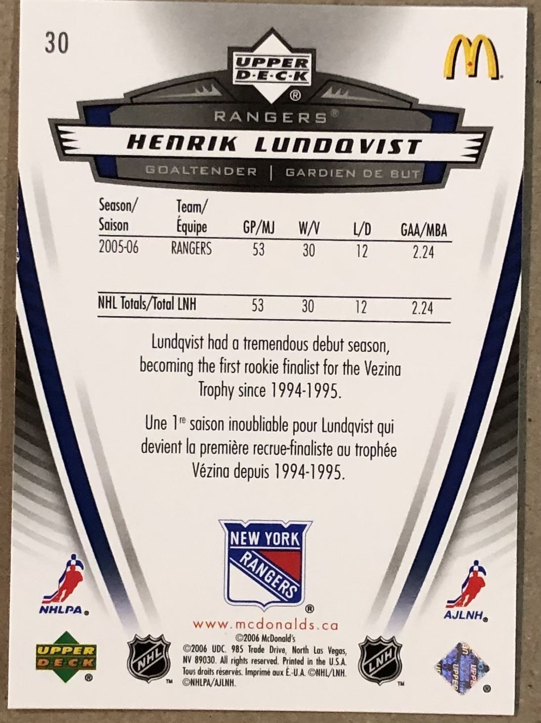 McDonald's #30 NHL, hockey, UD, regional