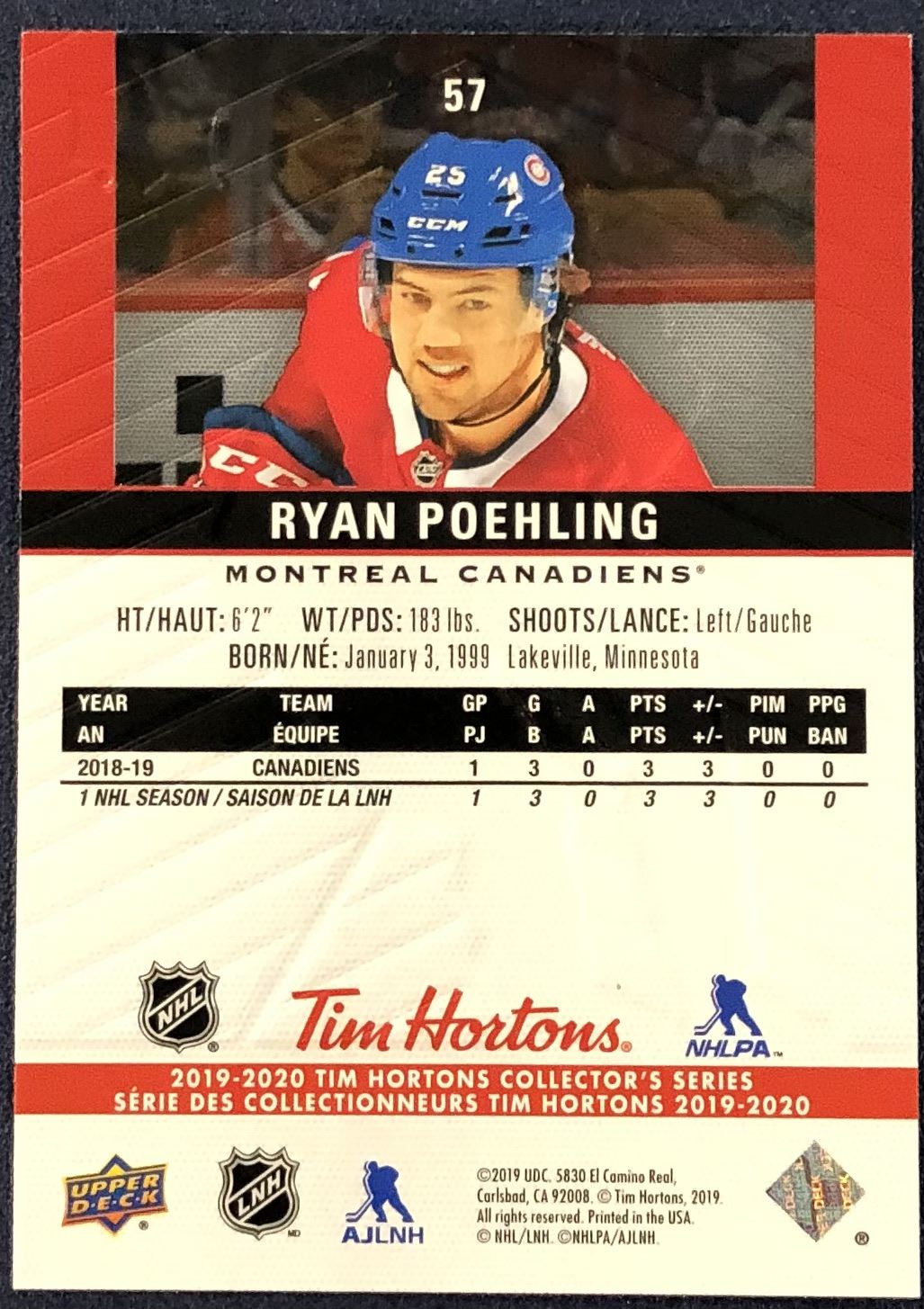 Lot 492 2019-20 UPPER DECK RYAN POEHLING ROOKIE CARD