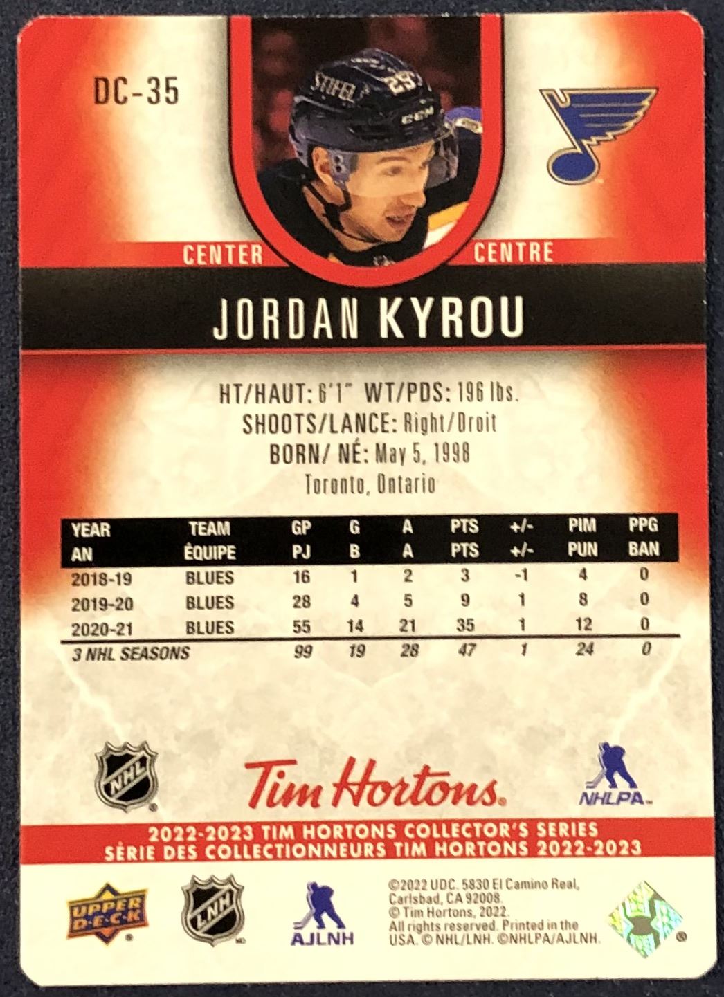 Lot 513 2022-23 UPPER DECK RED DIE CUT JORDAN KYROU