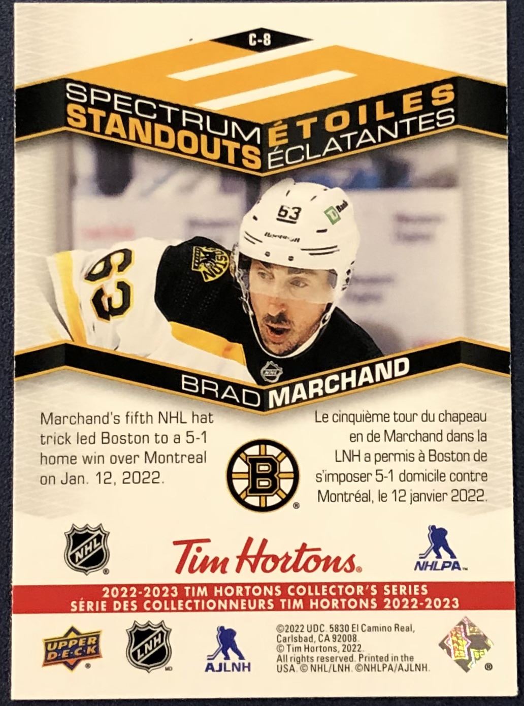 Lot 514 2022-23 UPPER DECK SPECTRUM STANDOUTS BRAD MARCHAND