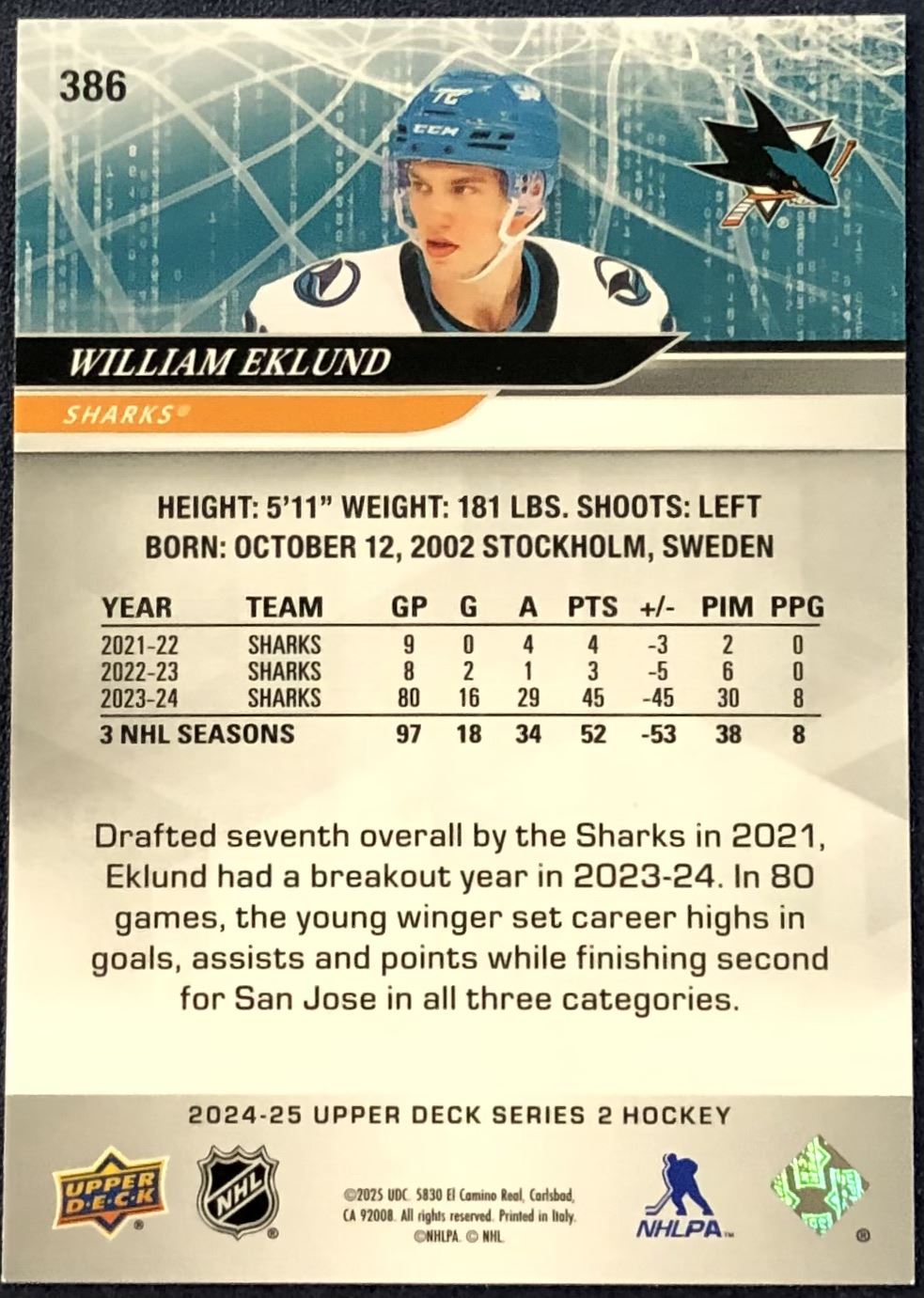 Lot 556 2024-25 UPPER DECK WILLIAM EKLUND ROOKIE CARD