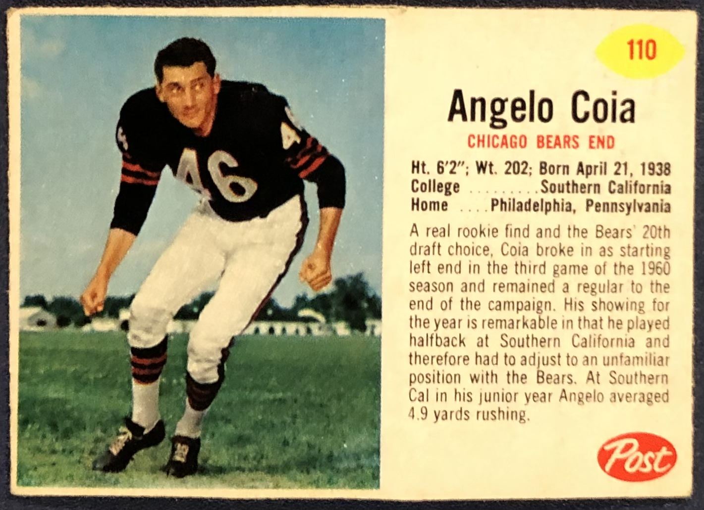 Lot 606 1962 POST CEREAL NFL FOOTBALL SHORT PRINT ANGELO COIA ROOKIE CARD
