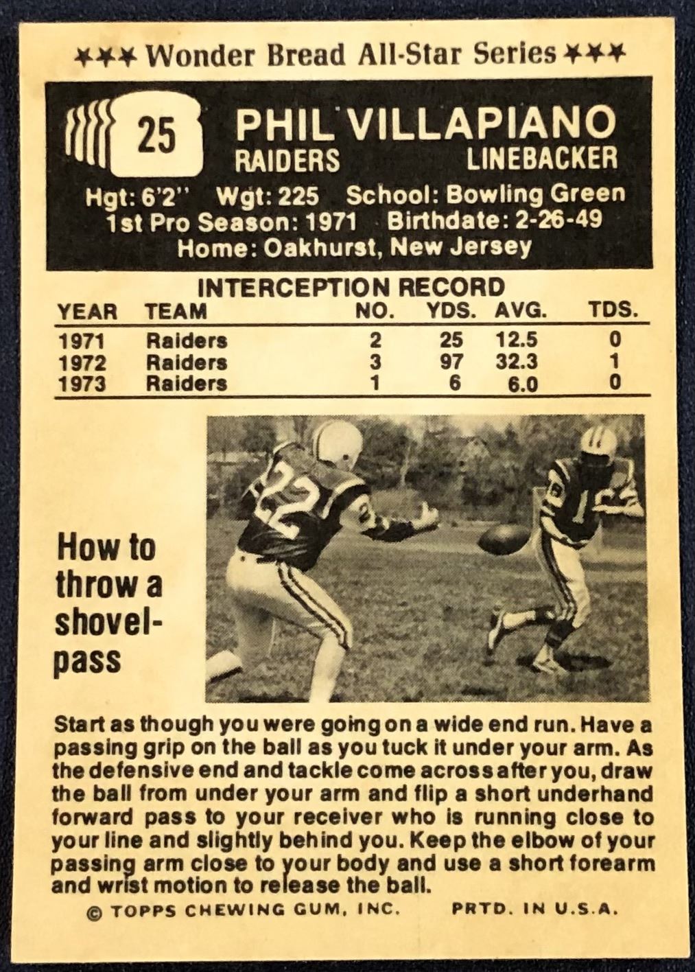 Lot 625 1974 TOPPS WONDER BREAD NFL FOOTBALL PHIL VILLAPIANO