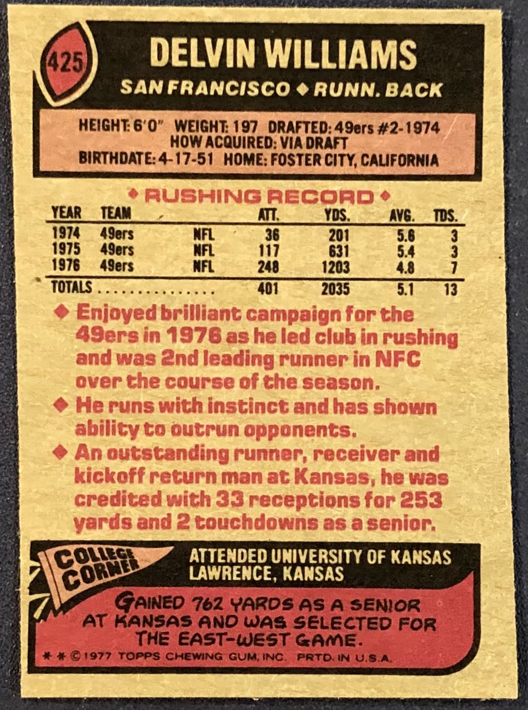 Lot 631 1977 TOPPS NFL FOOTBALL DELVIN WILLIAMS