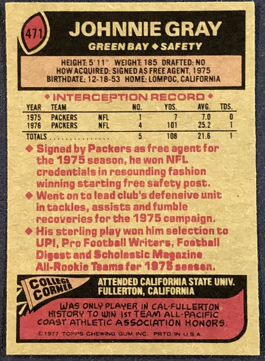 Lot 633 1977 TOPPS NFL FOOTBALL JOHNNIE GRAY