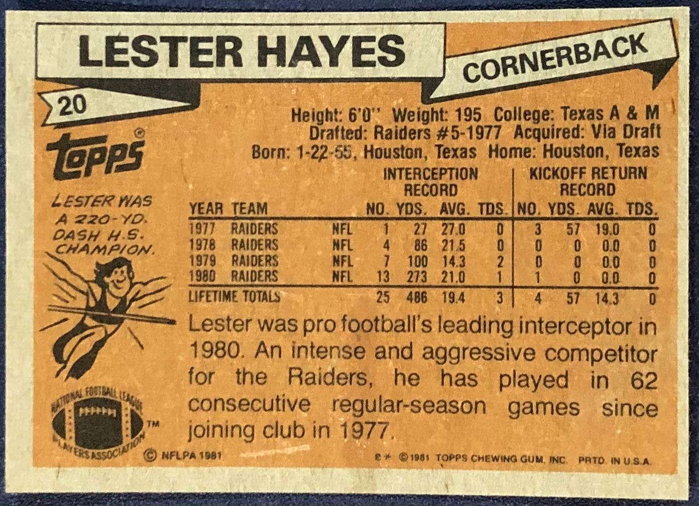 Lot 712 1981 TOPPS NFL LESTER HAYES