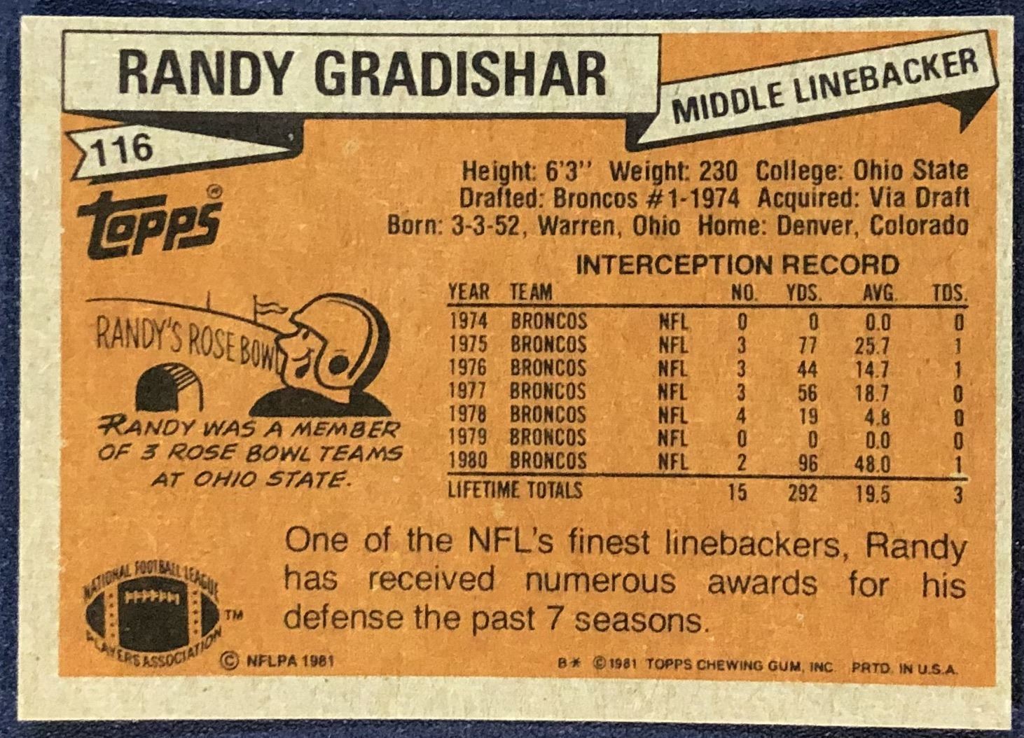 Lot 729 1981 TOPPS NFL RANDY GRADISHAR