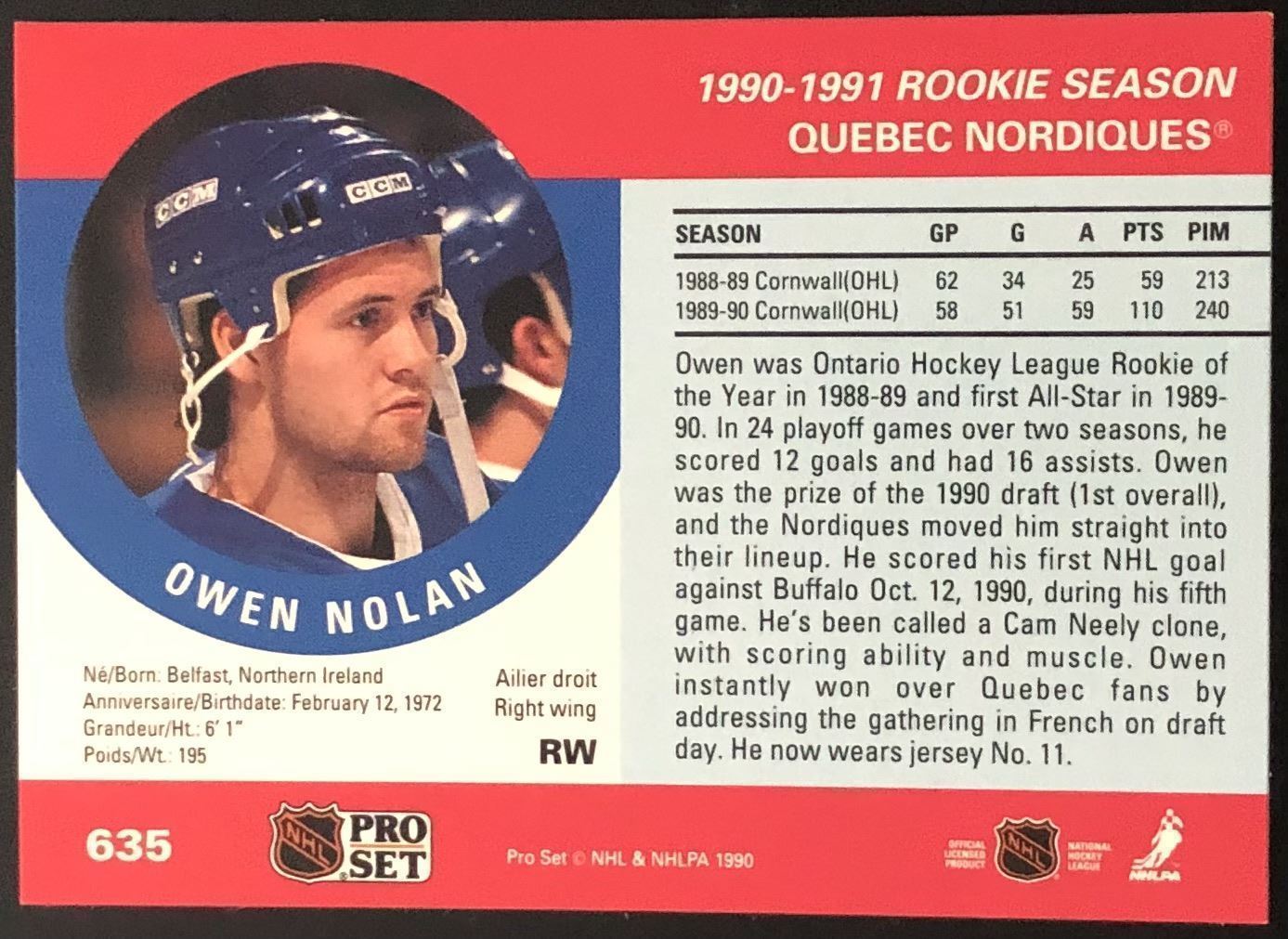 Lot 762 1990-91 PRO SET OWEN NOLAN ROOKIE CARD