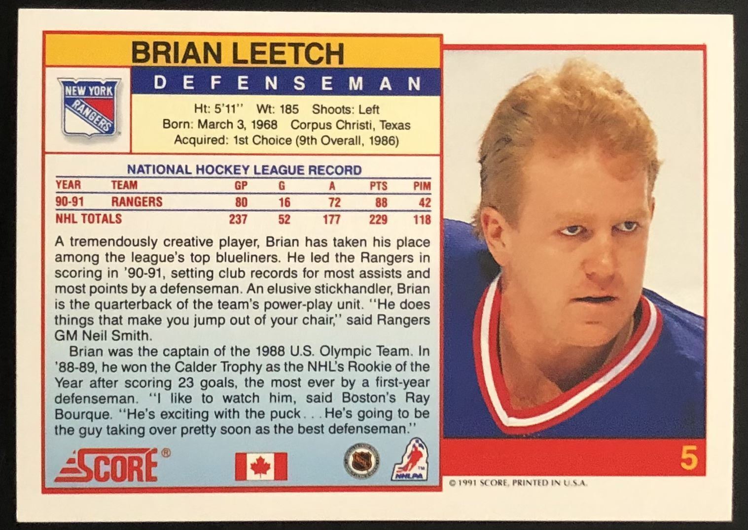Lot 801 1991-92 SCORE BRIAN LEETCH (HOF)