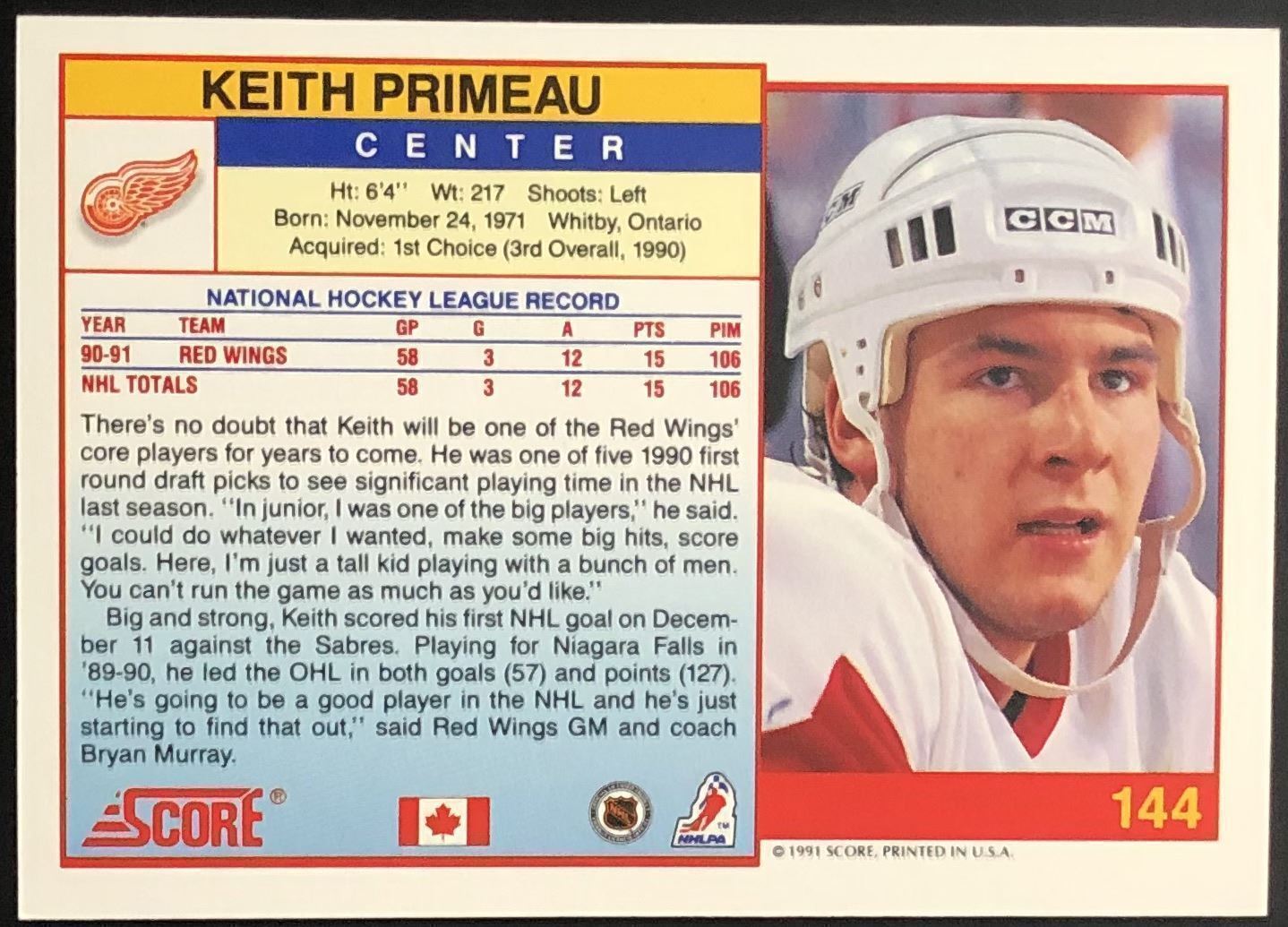 Lot 805 1991-92 SCORE KEITH PRIMEAU ROOKIE CARD