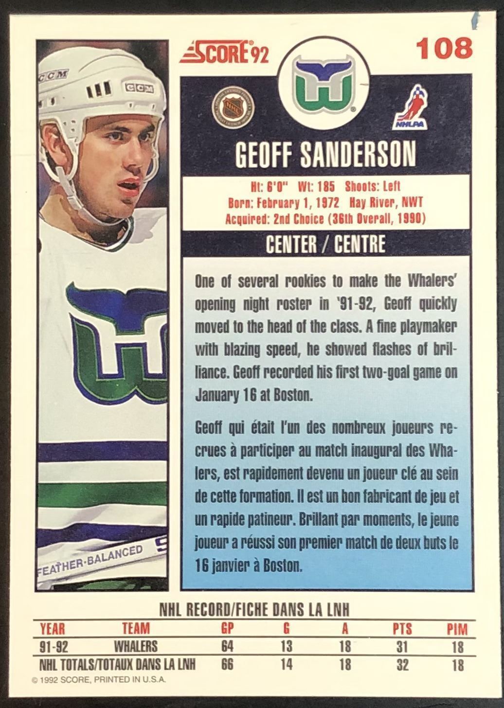 Lot 831 1992-93 SCORE GEOFF SANDERSON ROOKIE CARD