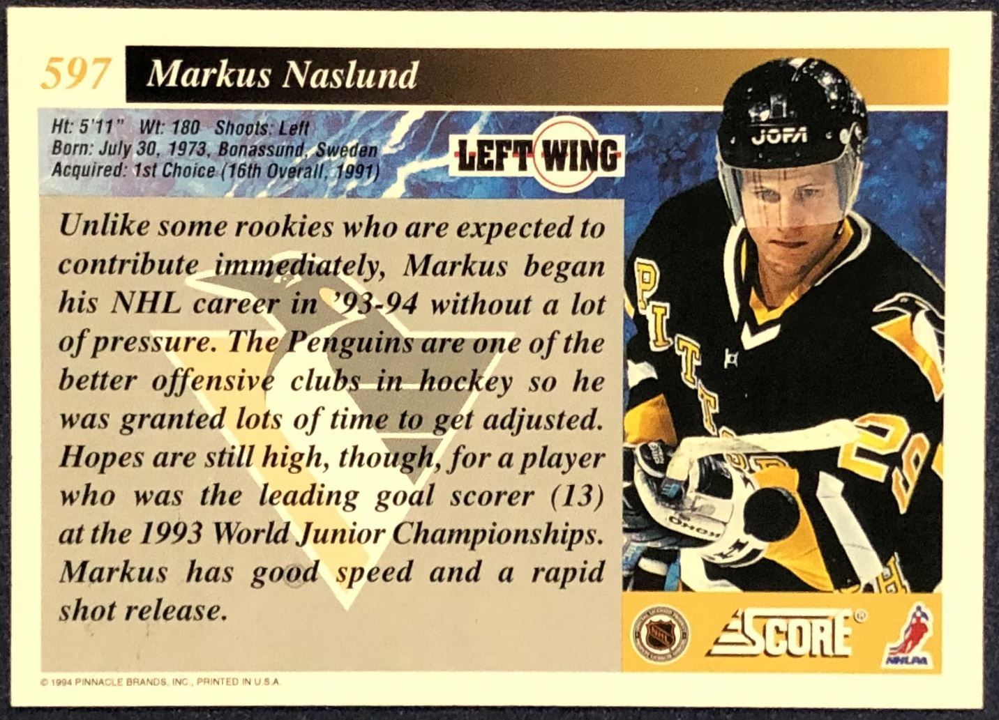 Lot 843 1994-95 SCORE MARKUS NASLUND ROOKIE CARD