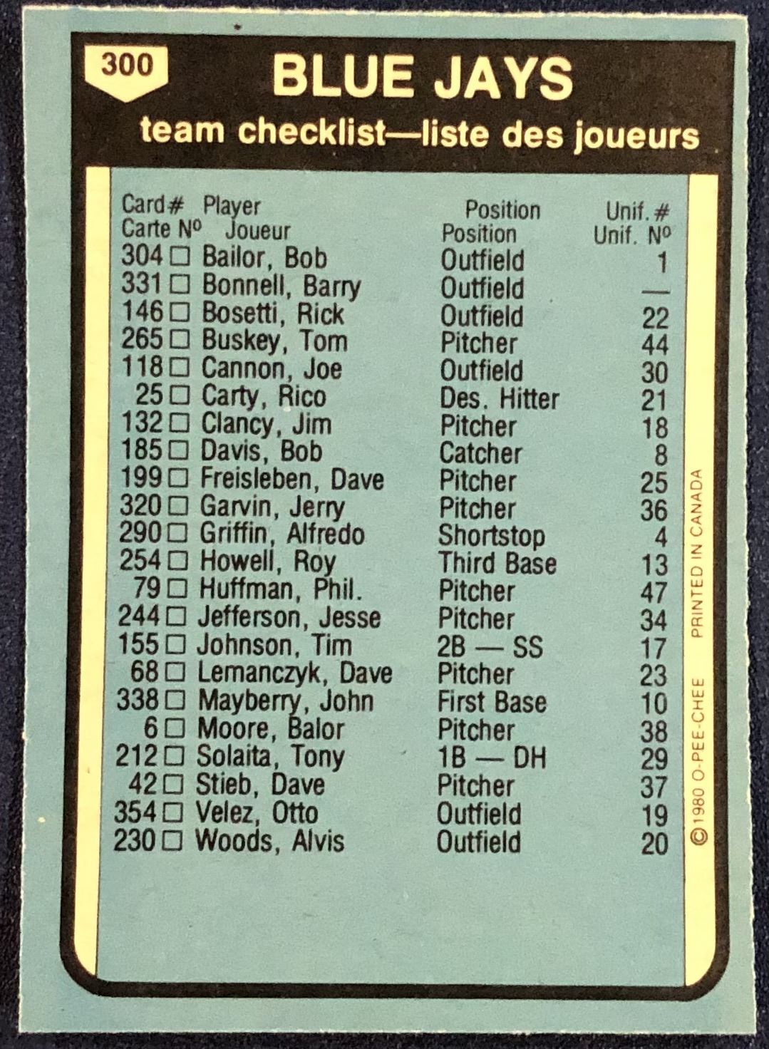 Lot 853 1980 O-PEE-CHEE TORONTO BLUE JAYS