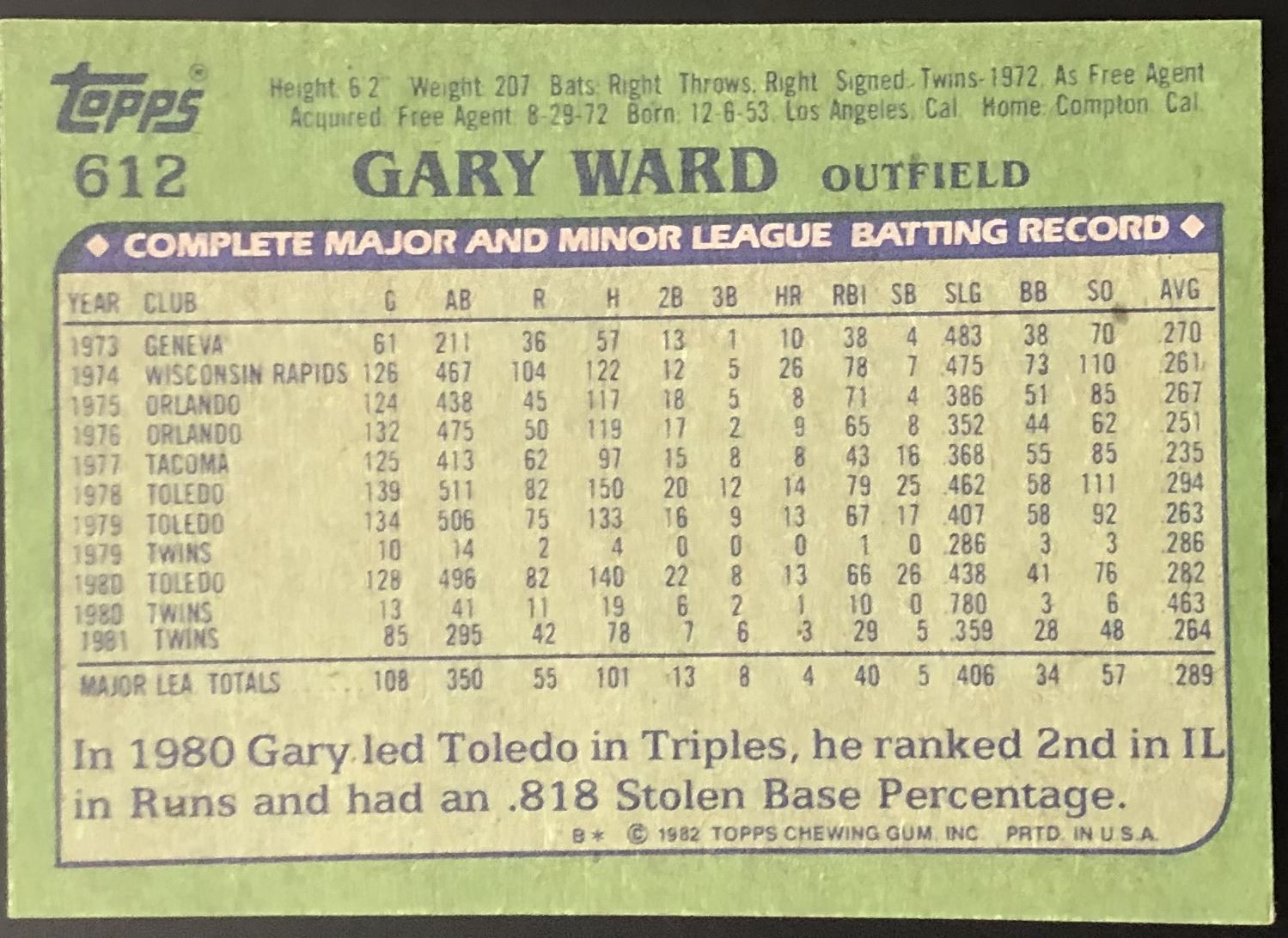 Lot 872 1982 TOPPS GARY WARD ROOKIE CARD