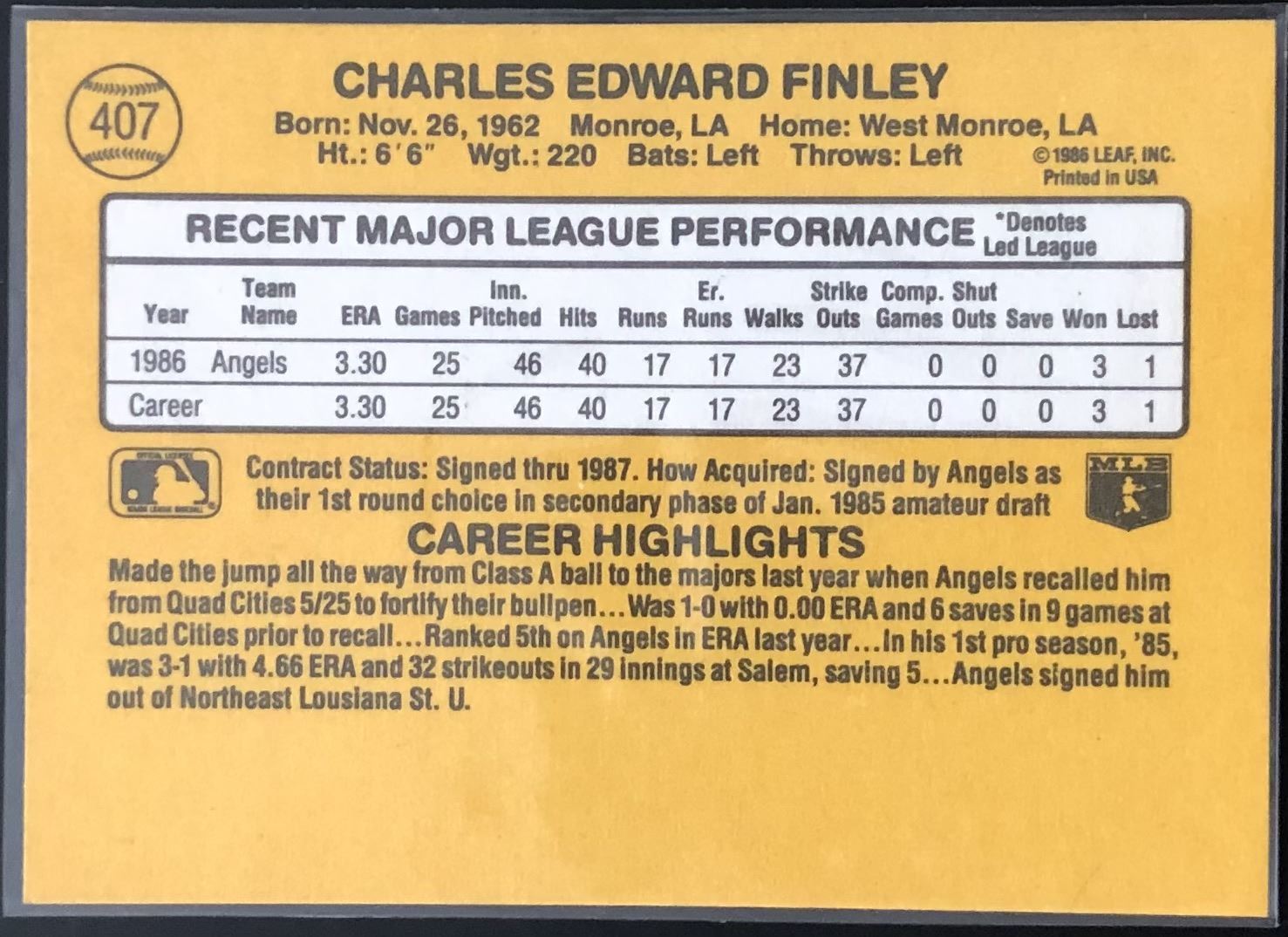 Lot 889 1987 DONRUSS CHUCK FINLEY ROOKIE CARD