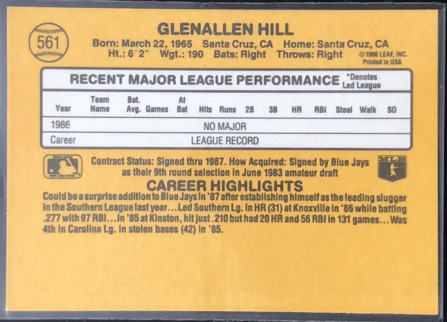 Lot 890 1987 DONRUSS GLENALLEN HILL ROOKIE CARD