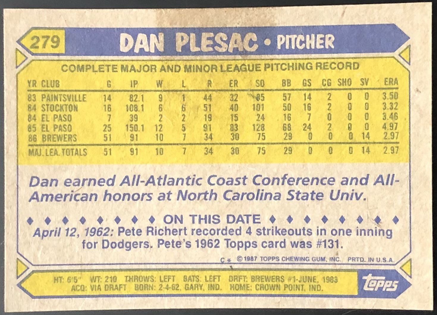 Lot 893 1987 TOPPS DAN PLESAC ROOKIE CARD