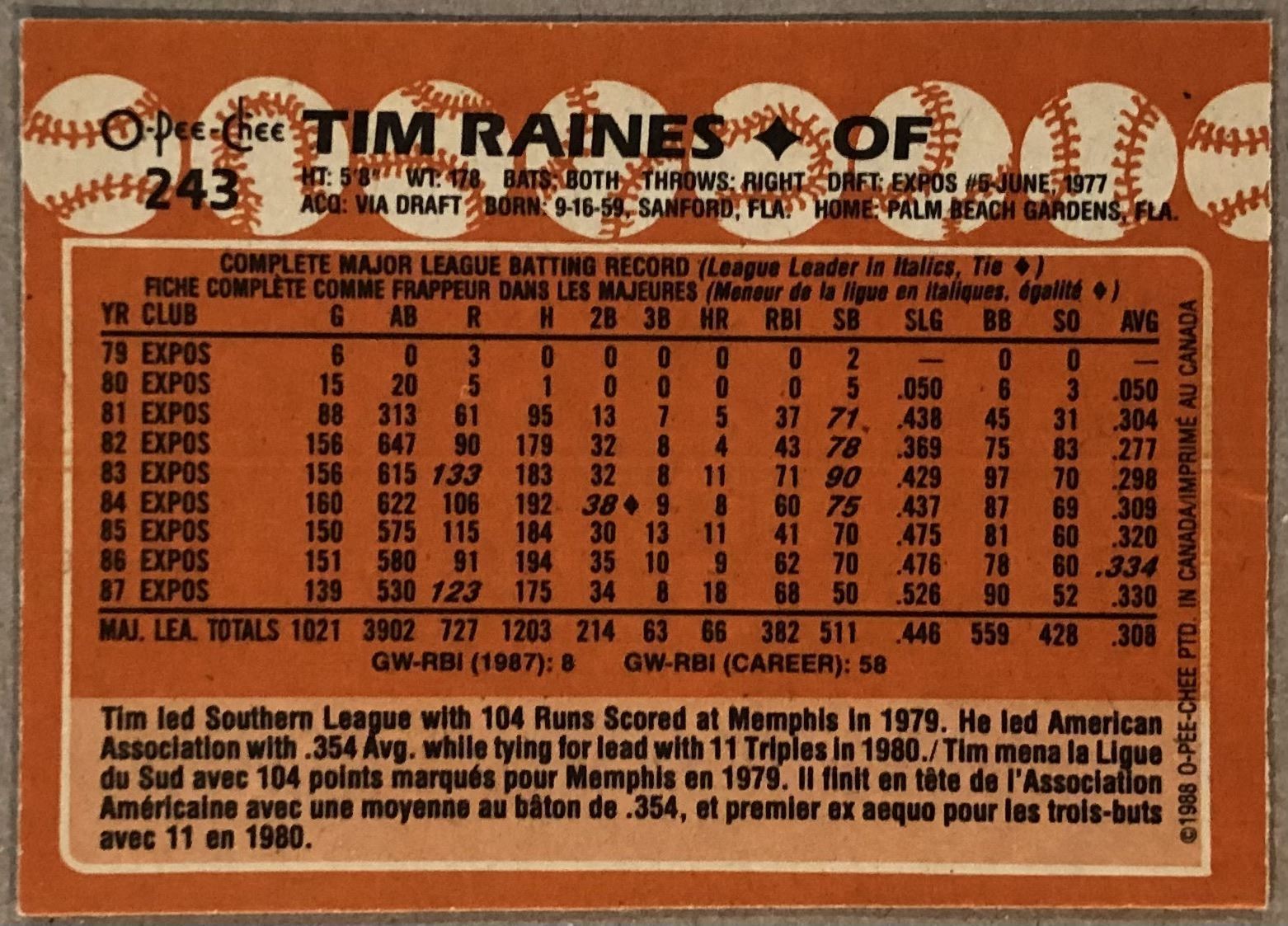 Lot 898 1988 O-PEE-CHEE TIM RAINES (HOF)