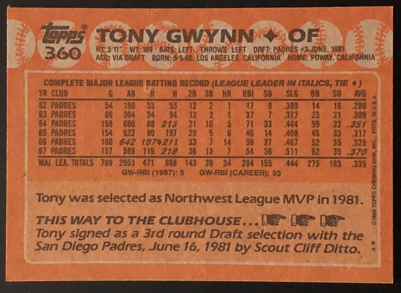 Lot 909 1988 TOPPS TONY GWYNN (HOF)