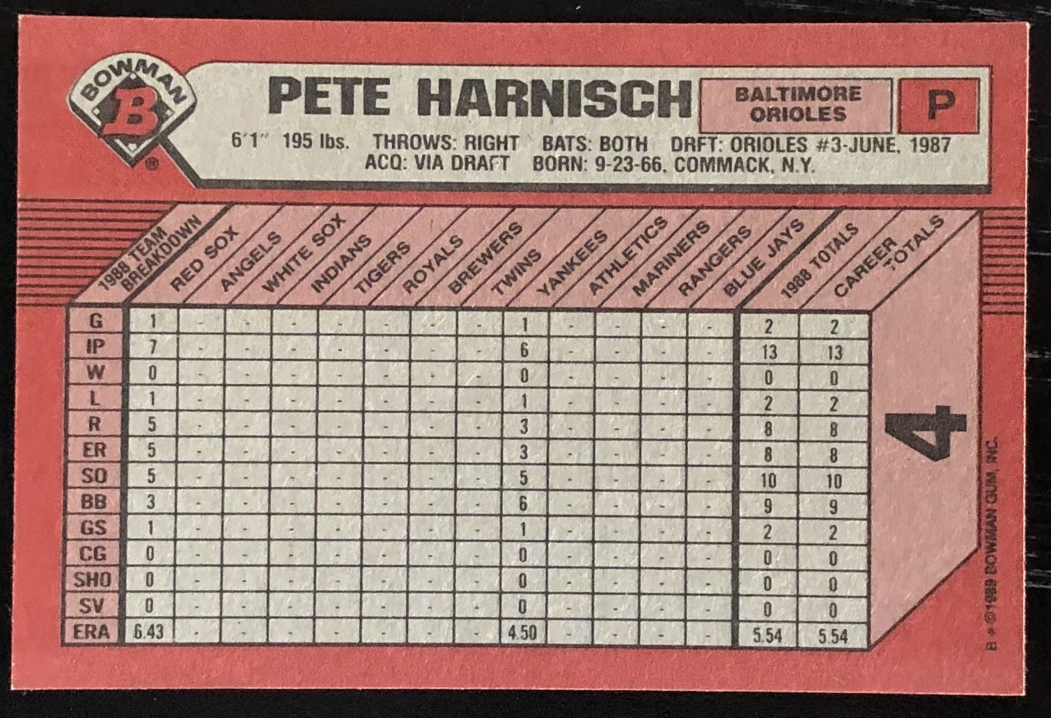 Lot 913 1989 BOWMAN PETE HARNISCH ROOKIE CARD