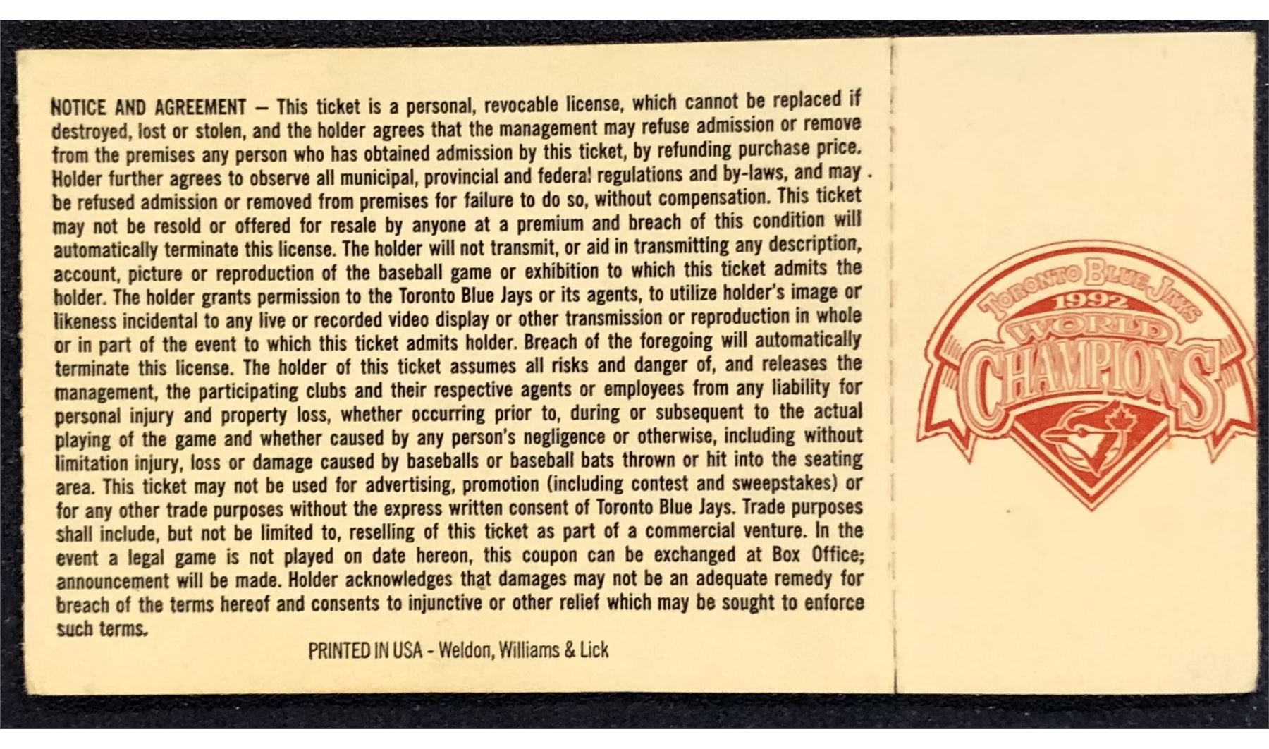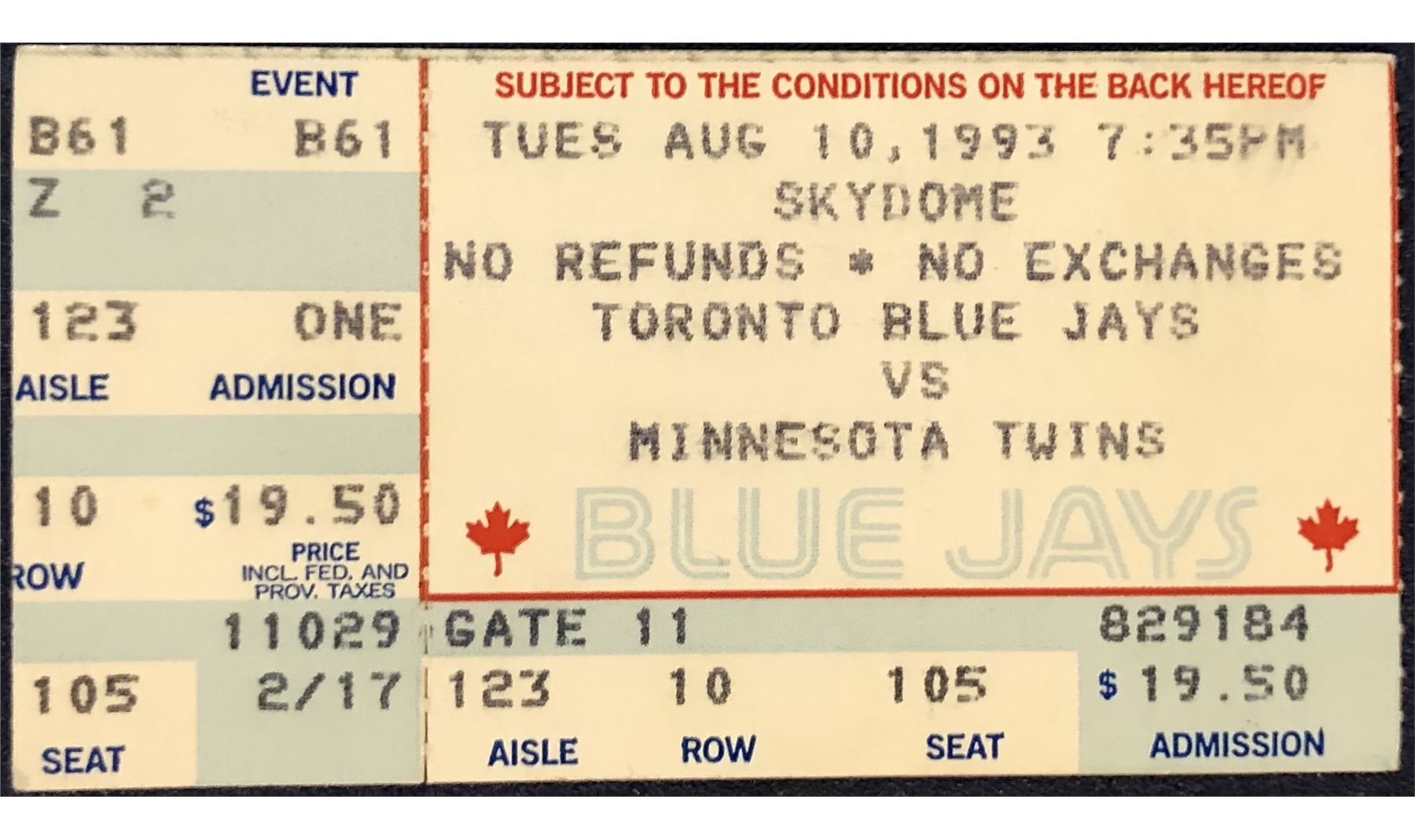 Lot 925 1993 MAJOR LEAGUE BASEBALL TICKET STUB - MINNESOTA at TORONTO