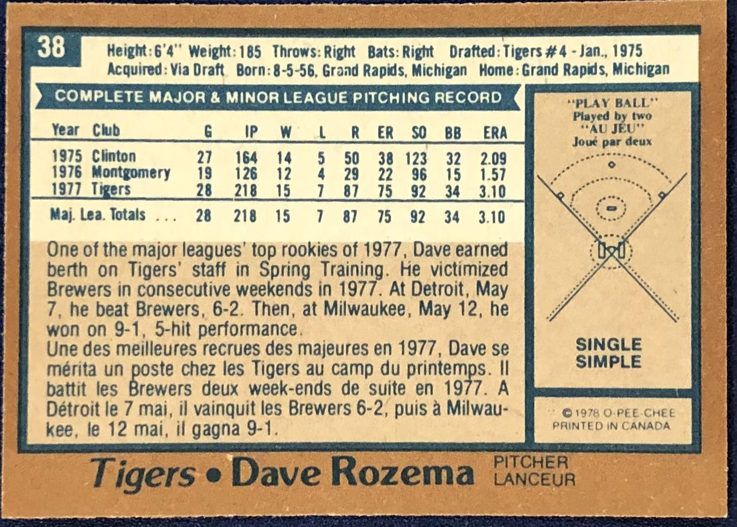 Lot 977 1978 O-PEE-CHEE DAVE ROZEMA ROOKIE CARD
