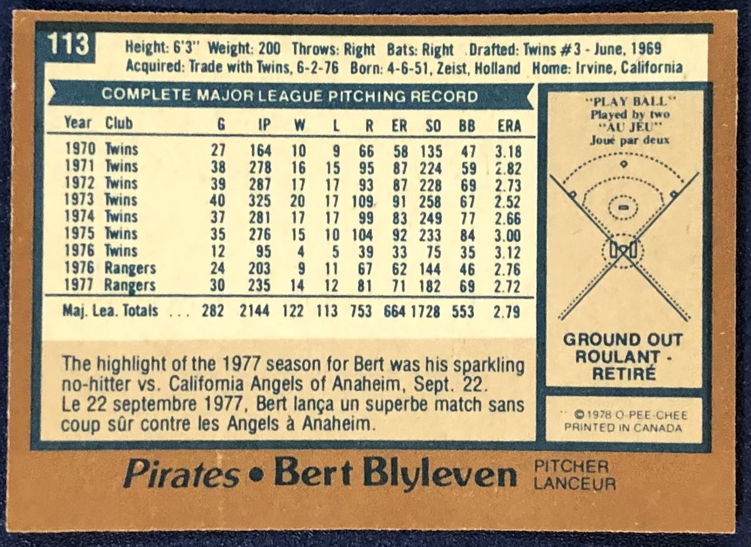 Lot 980 1978 O-PEE-CHEE BERT BLYLEVEN (HOF)
