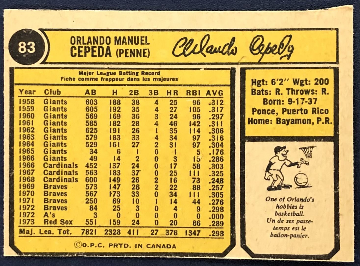 Lot 985 1974 O-PEE-CHEE ORLANDO CEPEDA (HOF)