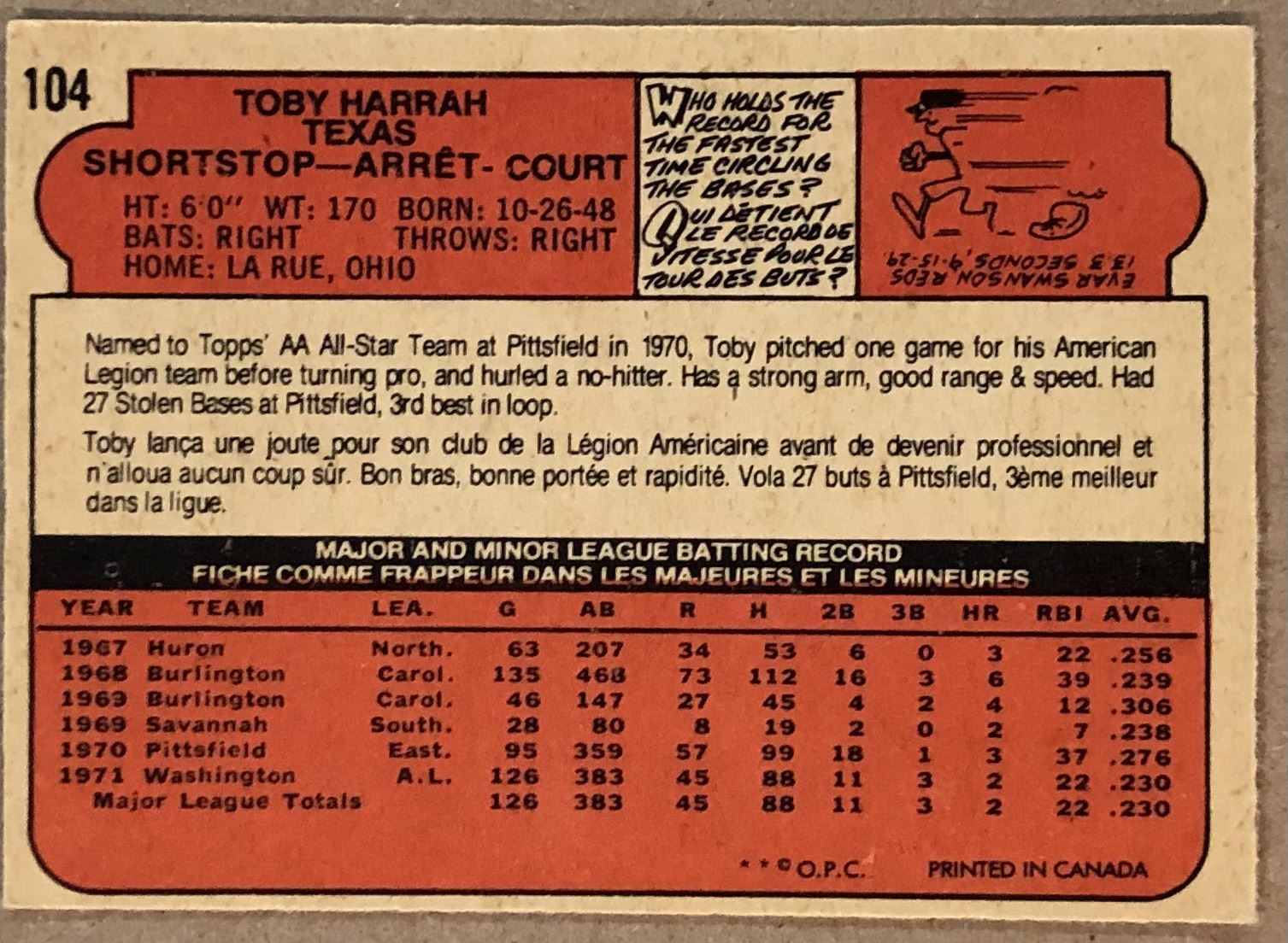 Lot 1019 1972 O-PEE-CHEE TOBY HARRAH ROOKIE CARD