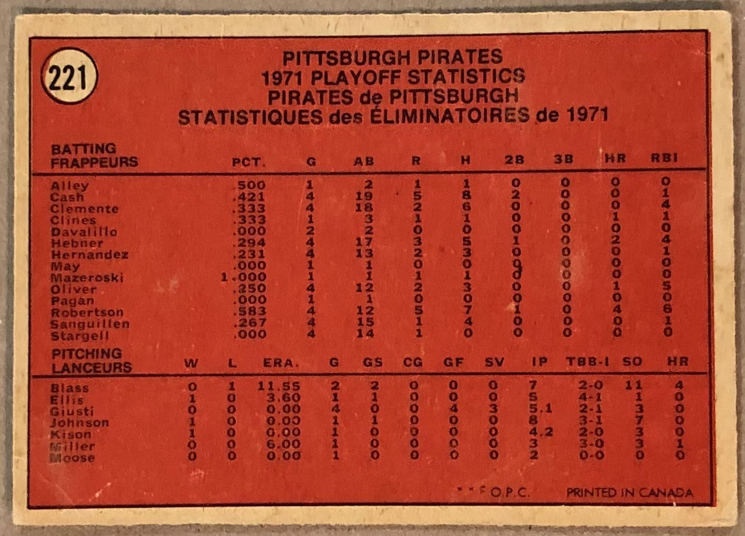 Lot 1024 1972 O-PEE-CHEE PIRATES N.L. CHAMPIONS