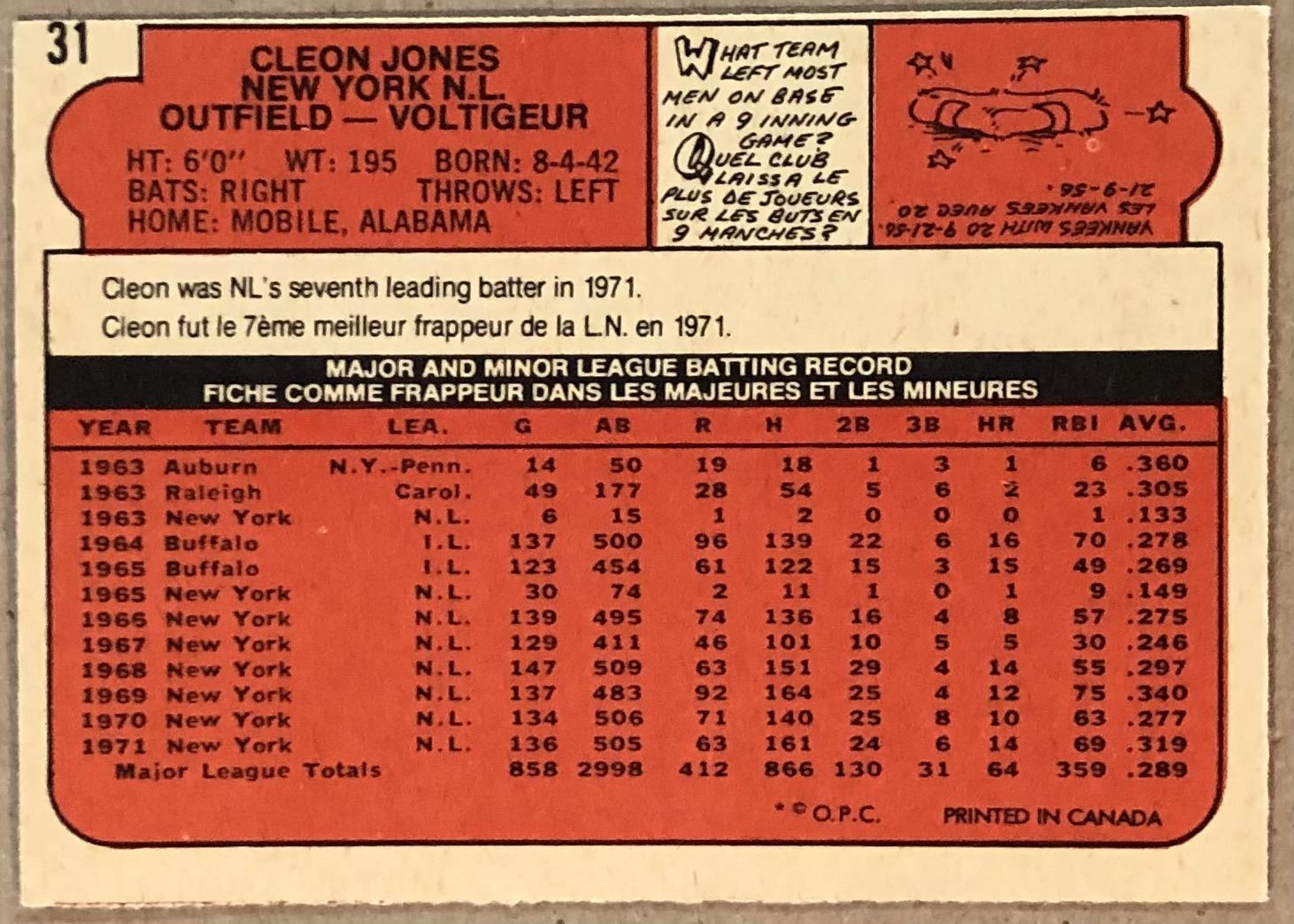 Lot 1038 1972 O-PEE-CHEE CLEON JONES