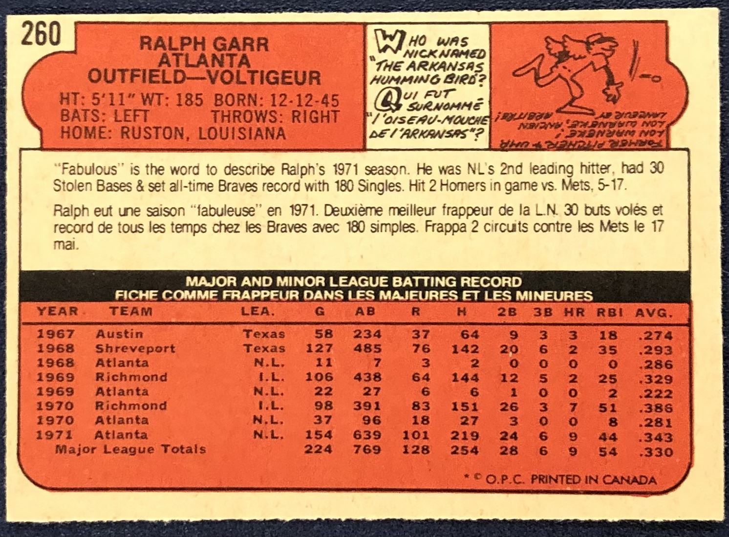 Lot 1047 1972 O-PEE-CHEE BASEBALL RALPH GARR