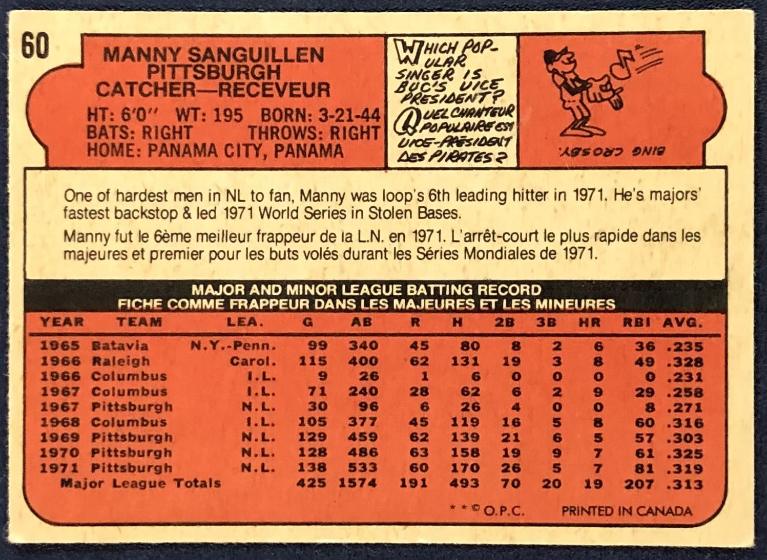 Lot 1048 1972 O-PEE-CHEE BASEBALL MANNY SANGUILLEN