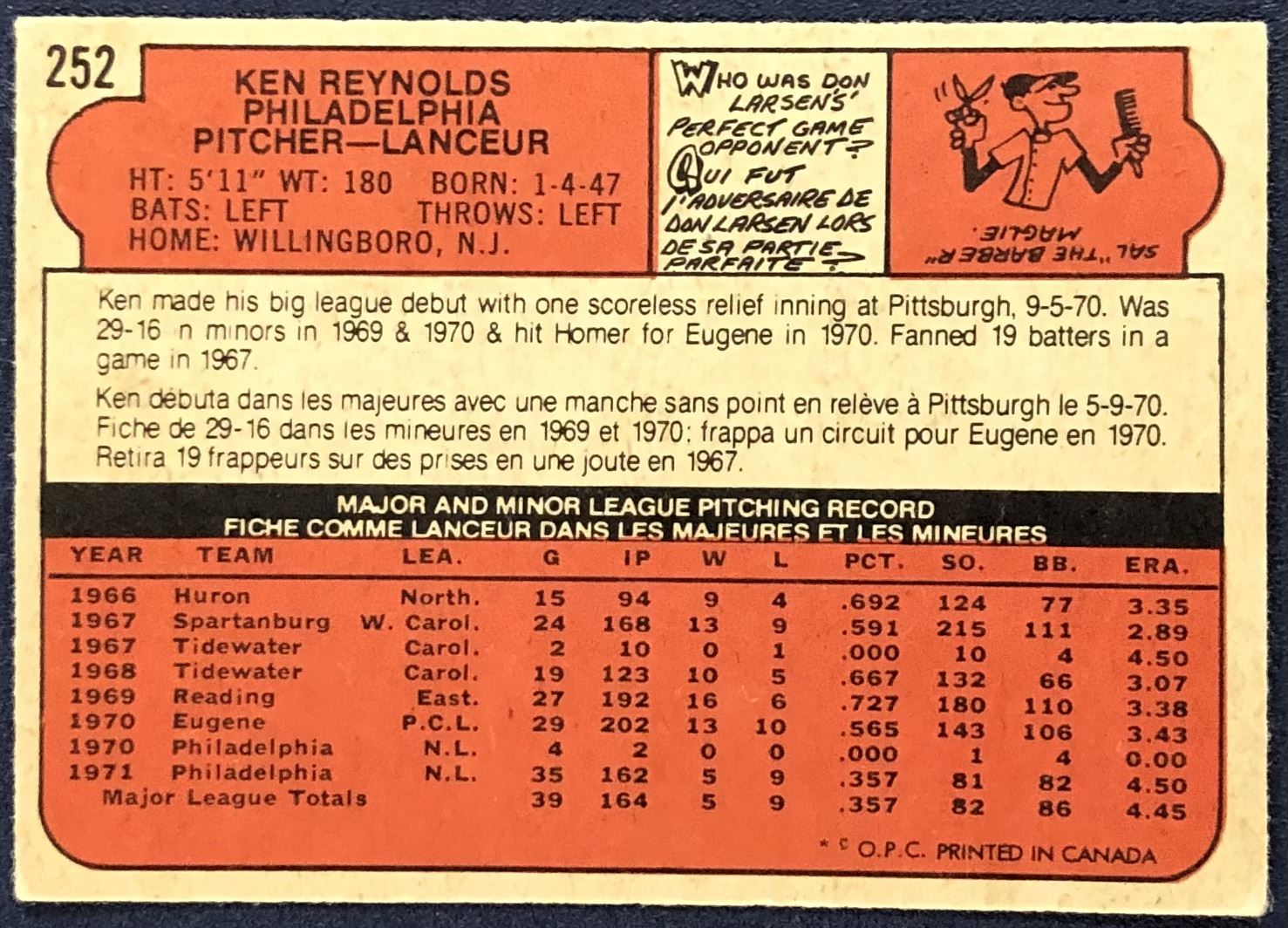 Lot 1049 1972 O-PEE-CHEE BASEBALL KEN REYNOLDS ROOKIE CARD