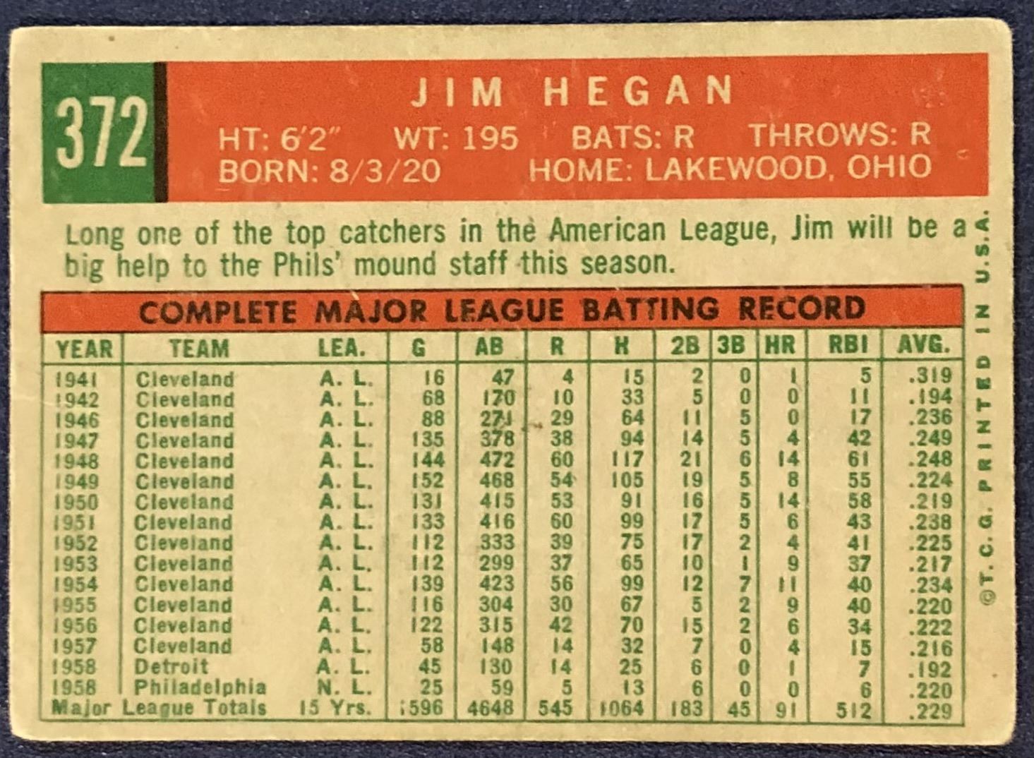 Lot 1130 1959 TOPPS JIM HEGAN