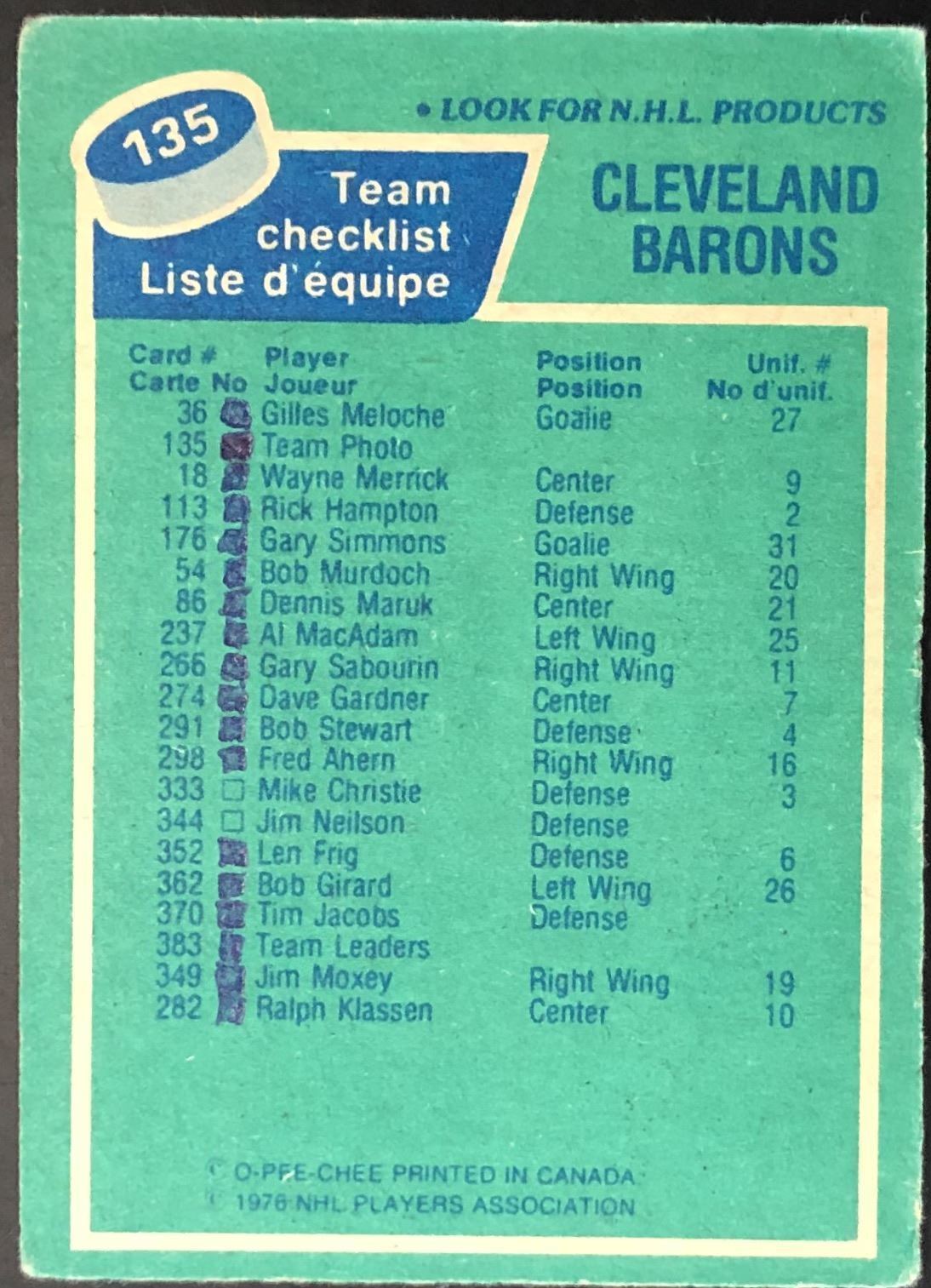 Card #135, ink on card's back NHL, hockey, OPC, vintage