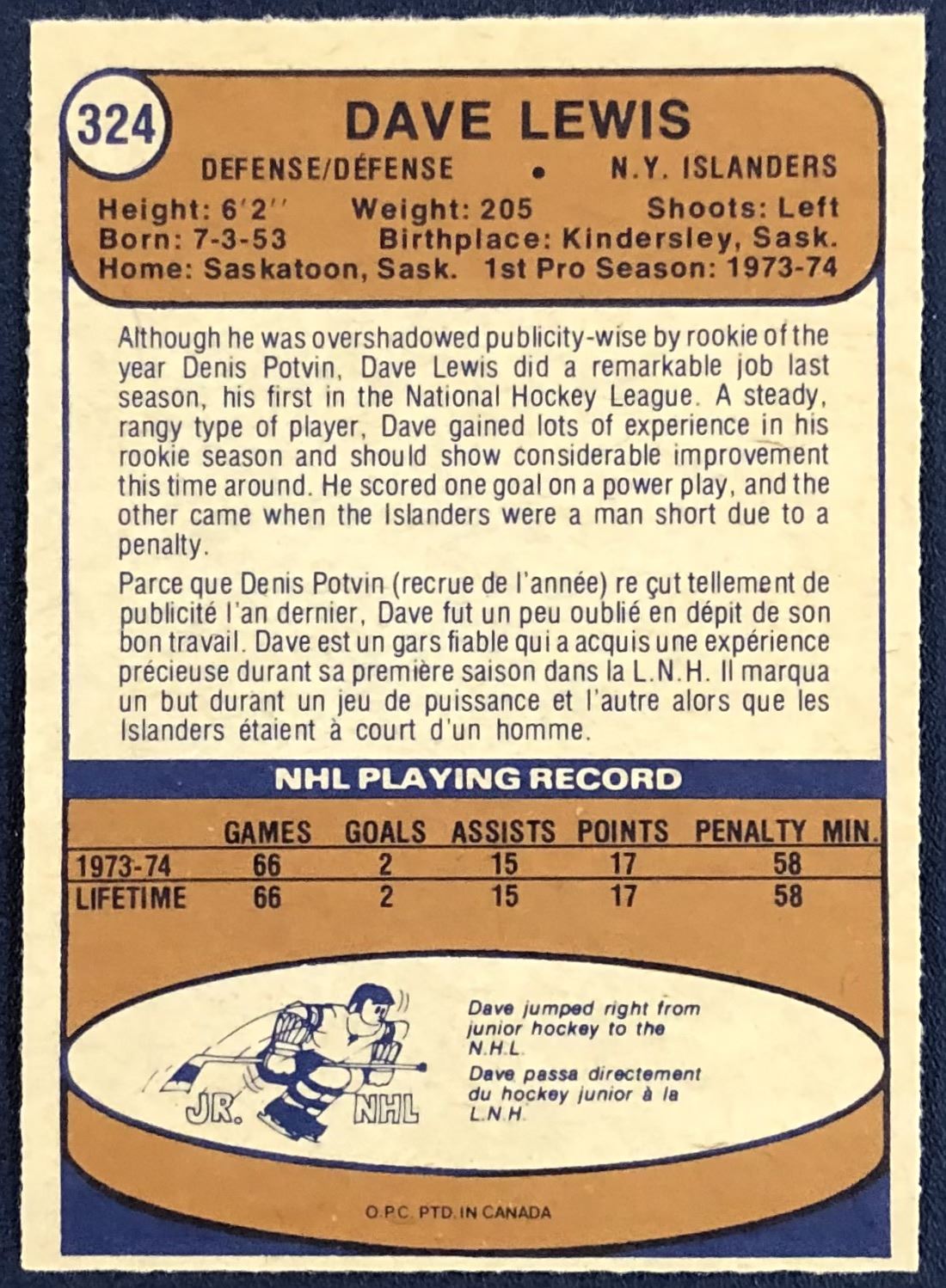 Lot 1335 1974-75 O-PEE-CHEE DAVE LEWIS ROOKIE CARD