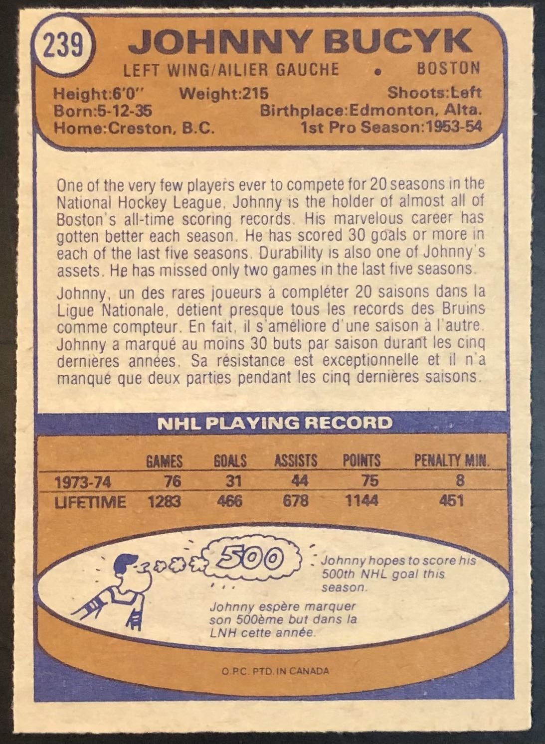 Lot 1341 1974-75 O-PEE-CHEE JOHNNY BUCYK (HOF)