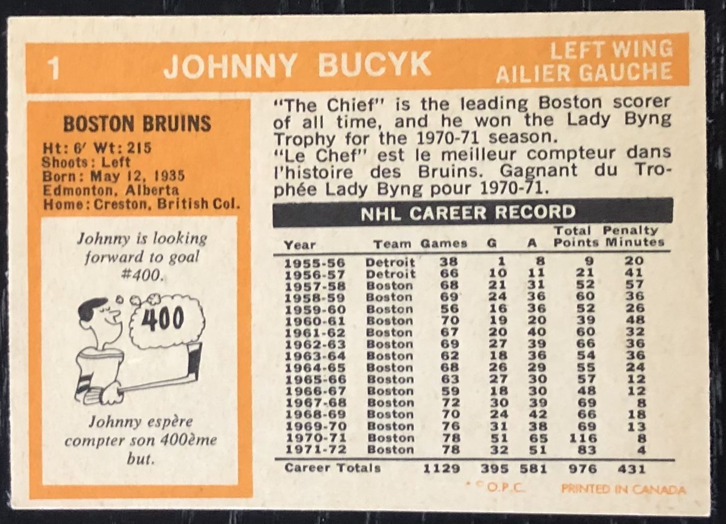 Lot 1368 1972-73 O-PEE-CHEE JOHNNY BUCYK (HOF)
