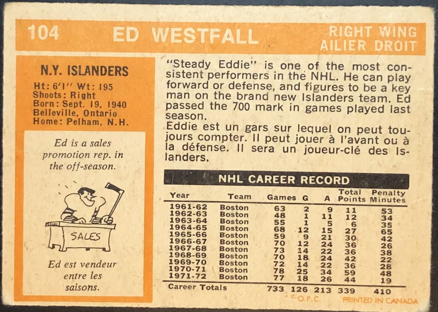 Card #104 NHL, hockey, OPC, vintage