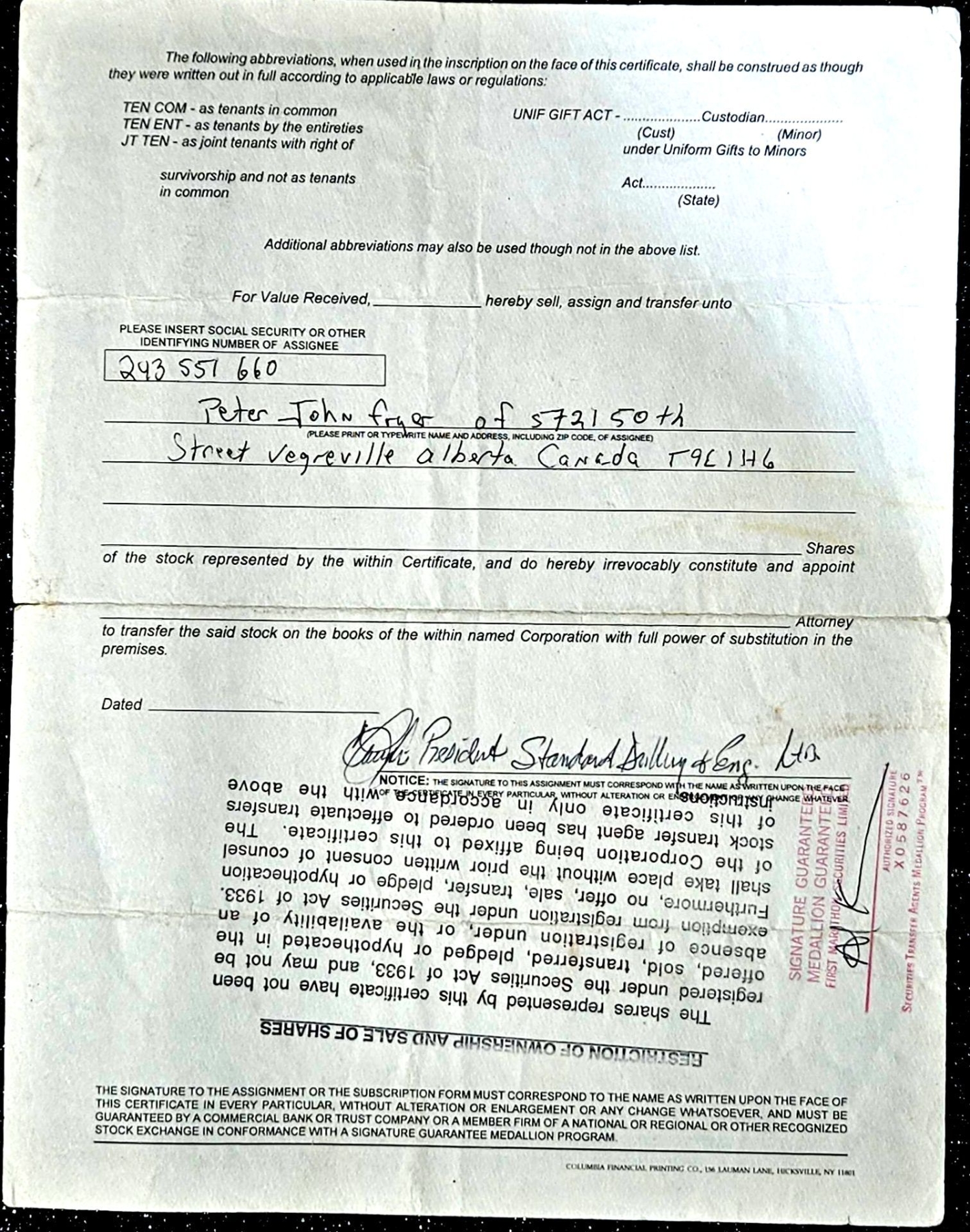 Vintage stock certificate with its authenticity papers.