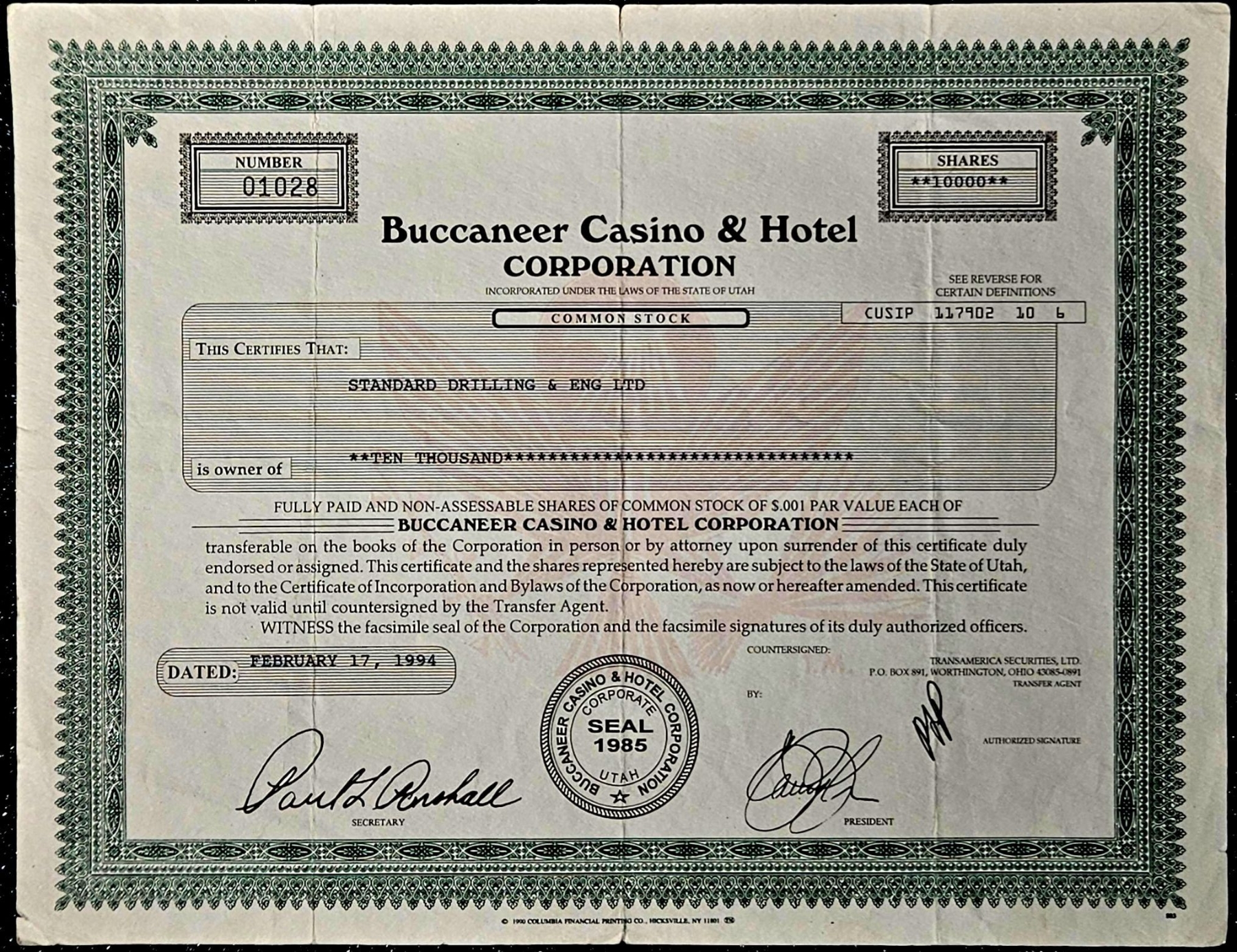 Lot 146 Vintage Stock Certificate (1994, Buccaneer Casino & Hotel Corporation)