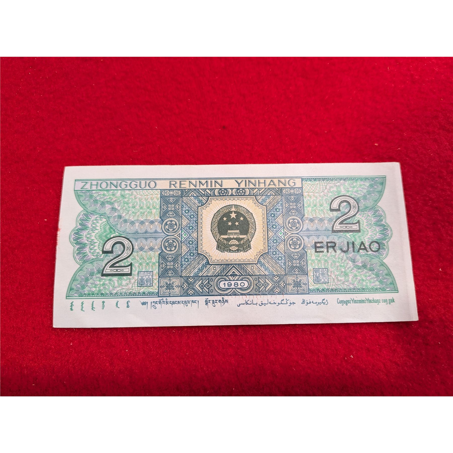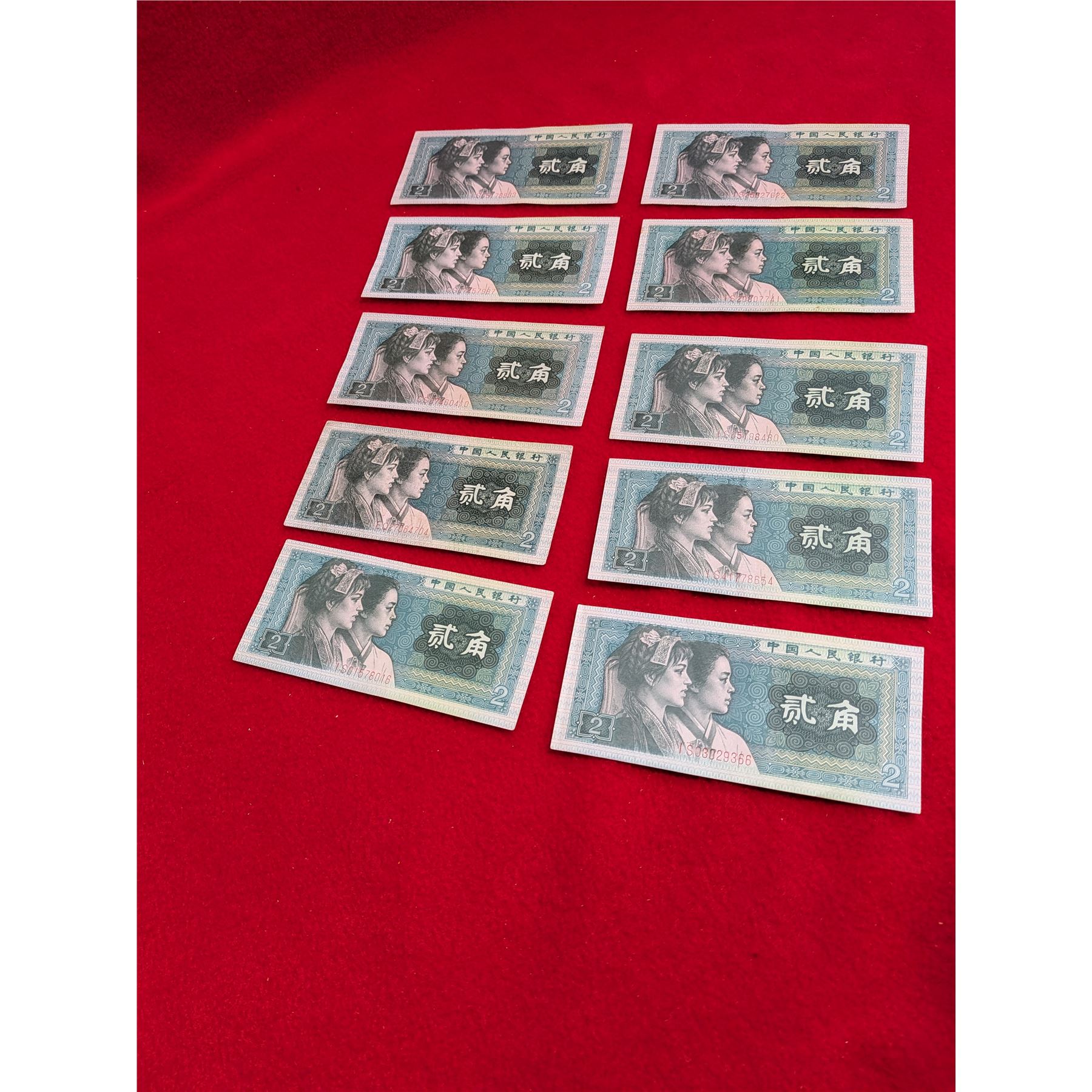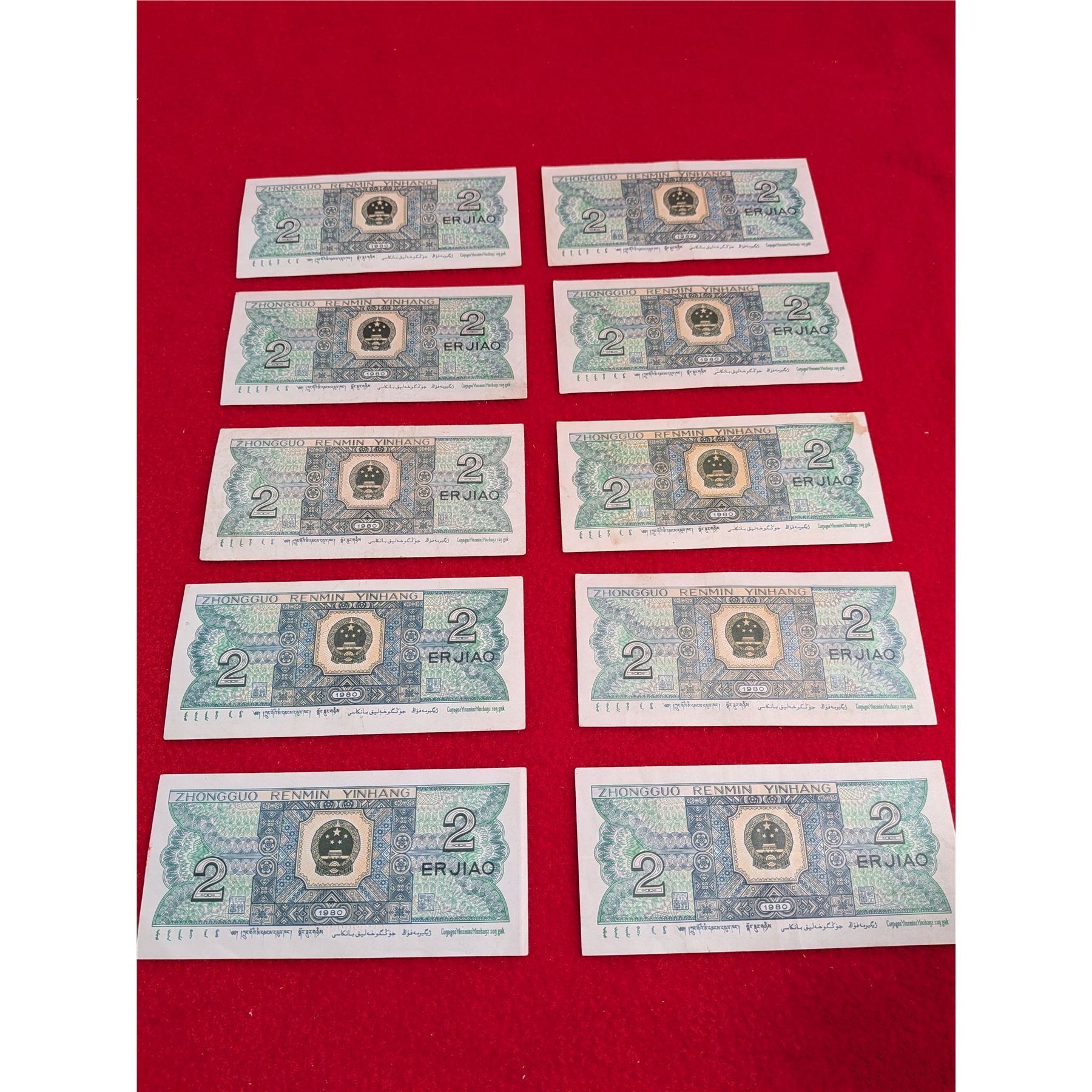 Ten vintage Chinese 2 Jiao banknote from the Fourth Series Renminbi, issued in 1980.