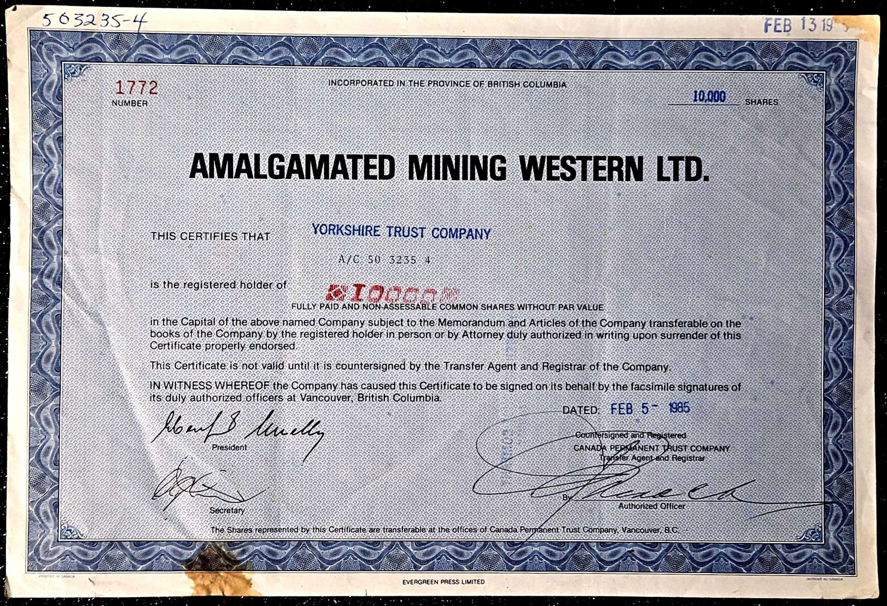 Lot 151 Vintage Stock Certificate (1985, Amalgamated Mining Western Ltd.) #4