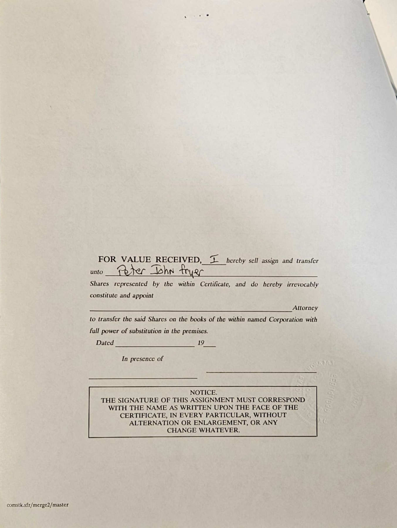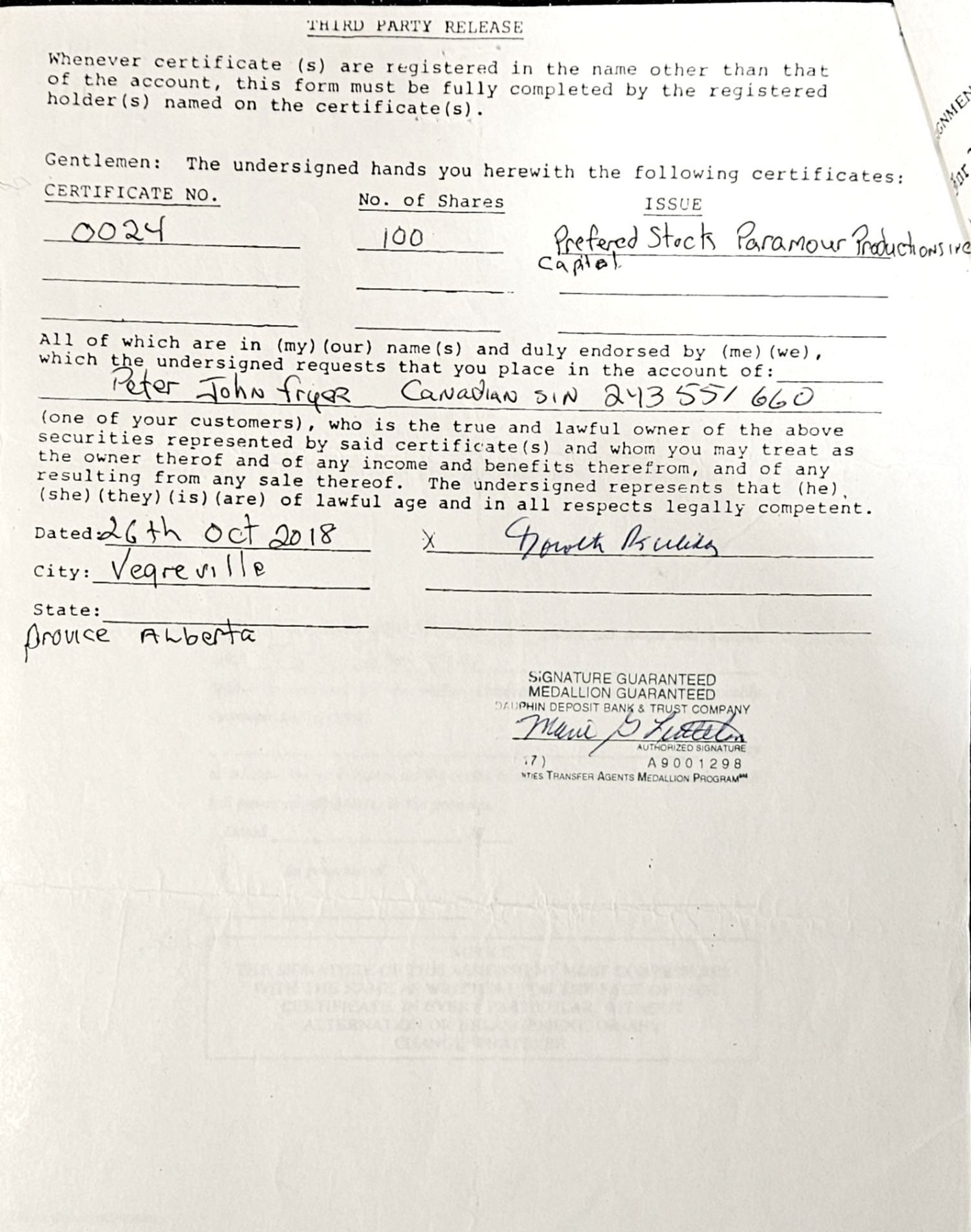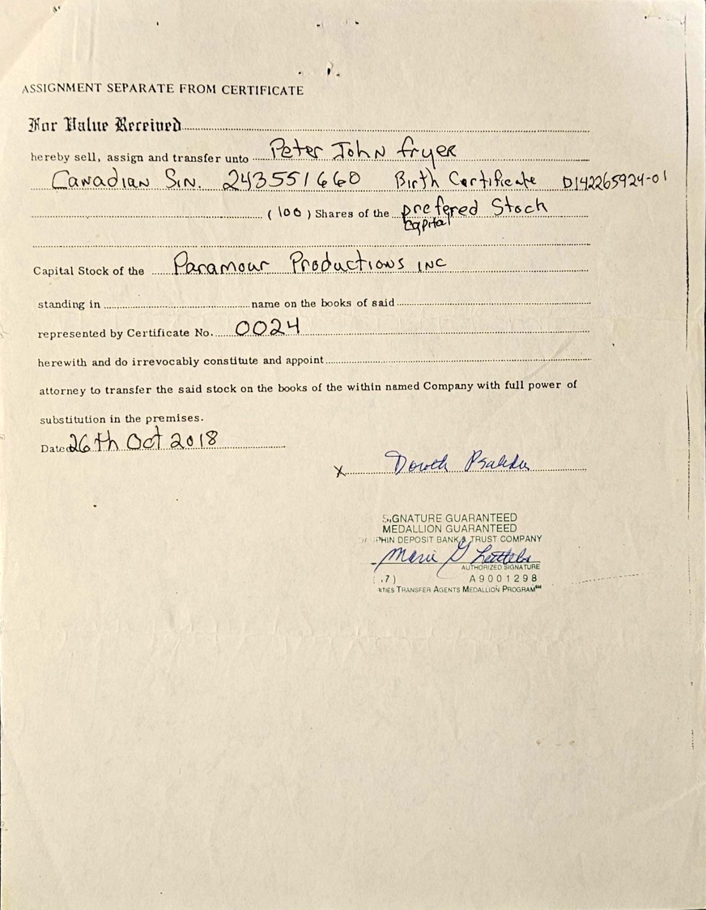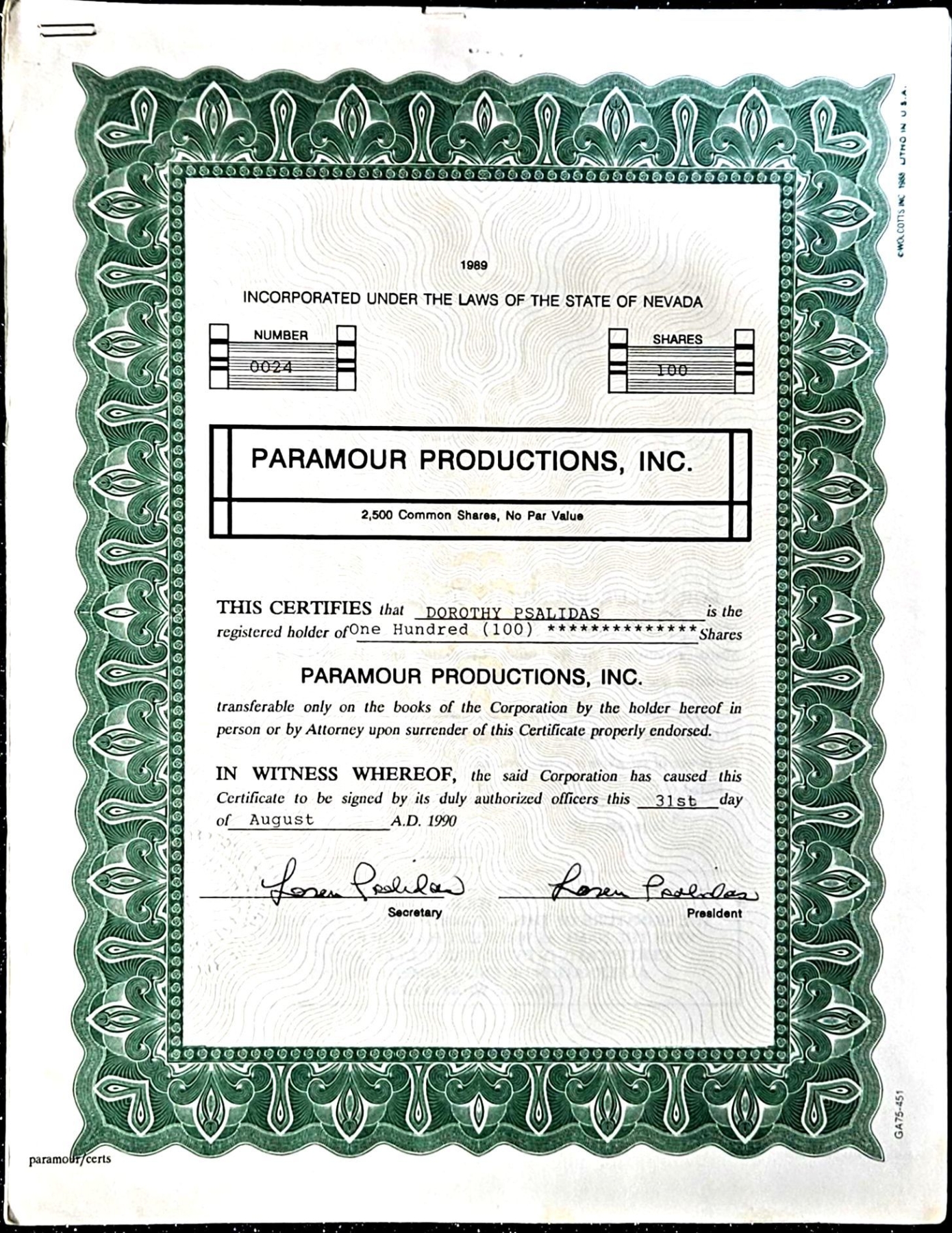 Lot 152 Vintage Stock Certificate (1990, Paramour Productions, Inc.) #1