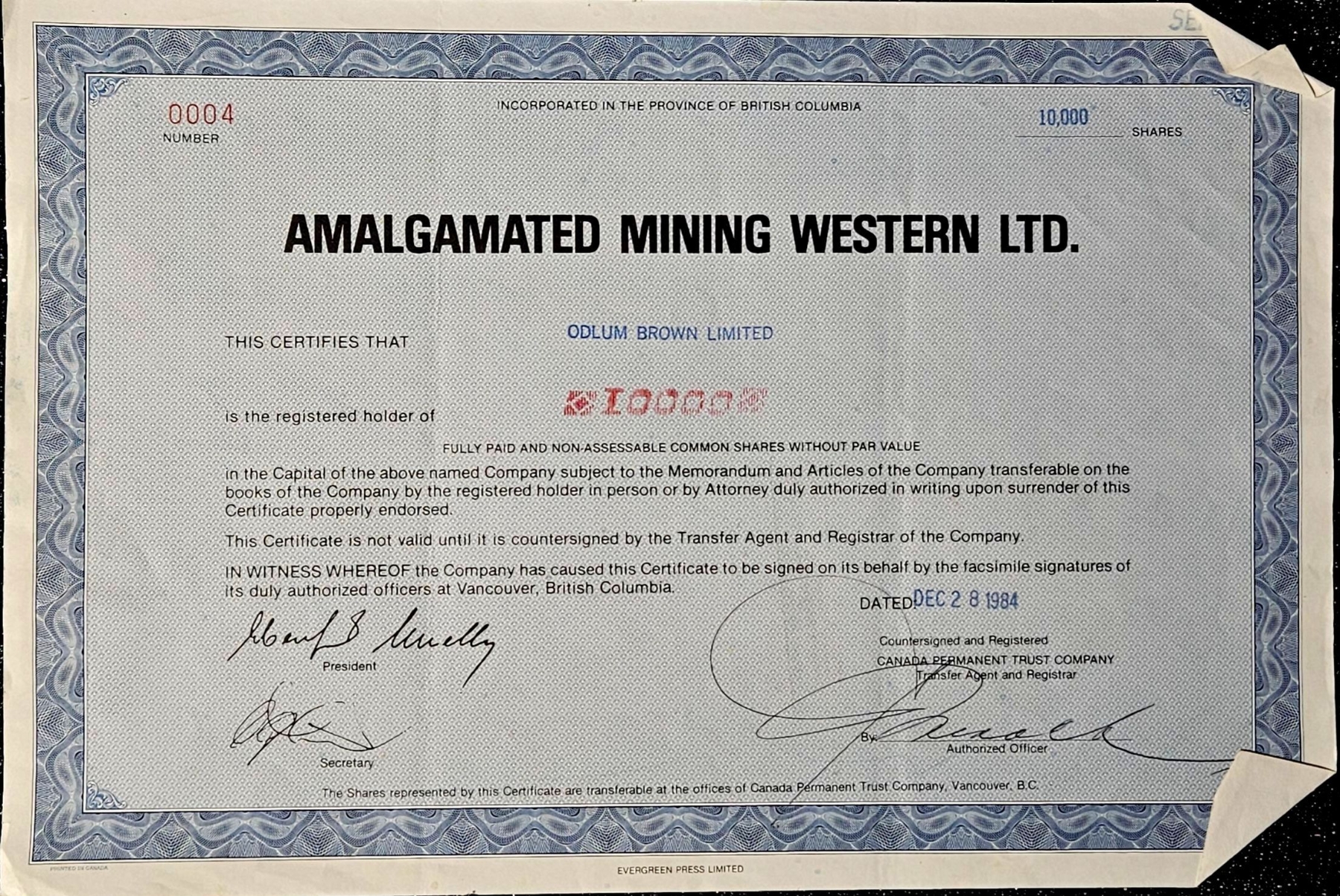 Lot 155 Vintage Stock Certificate (1984, Amalgamated Mining Western Ltd.) #3